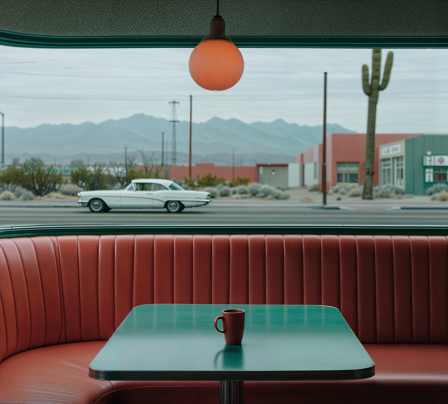 Retro diner booth with red leather seats, green table, and a red mug. Outside, a vintage car, cactus, and mountains complete the nostalgic vibe.