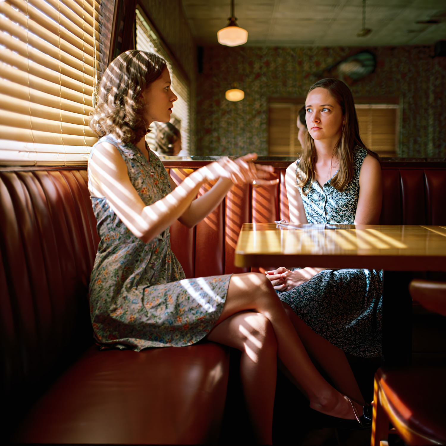 Two women in a retro diner booth, one gesturing while talking, the other listening, with sunlight streaming through blinds.