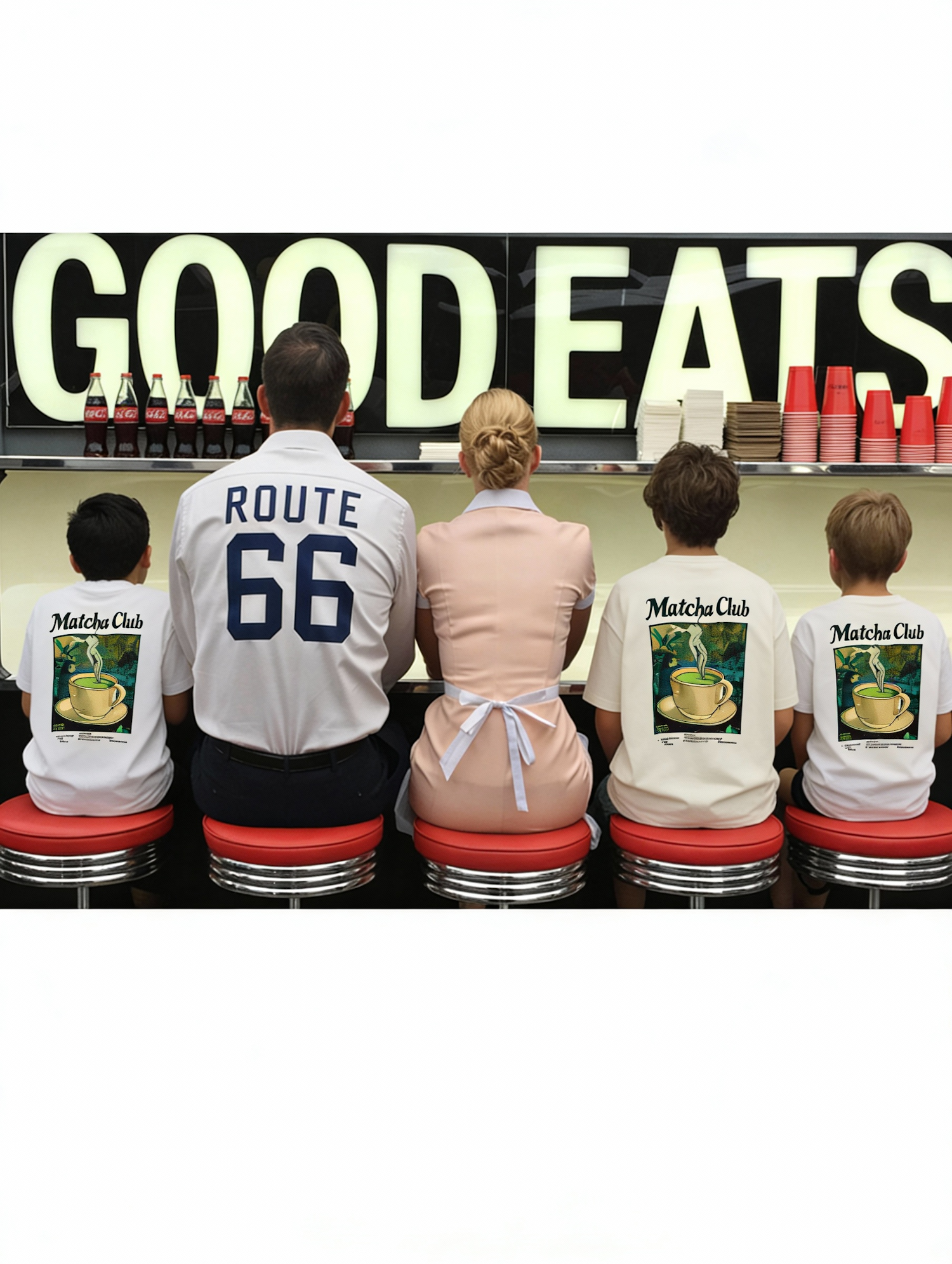 A retro diner scene with a family seated at the counter, wearing coordinated outfits, under a 'GOOD EATS' sign.