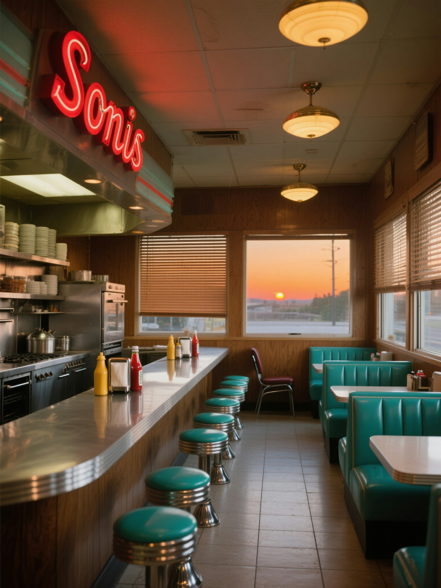 Retro diner with teal stools, stainless steel counter, and sunset view through windows. Neon 'Sonis' sign adds a nostalgic touch.