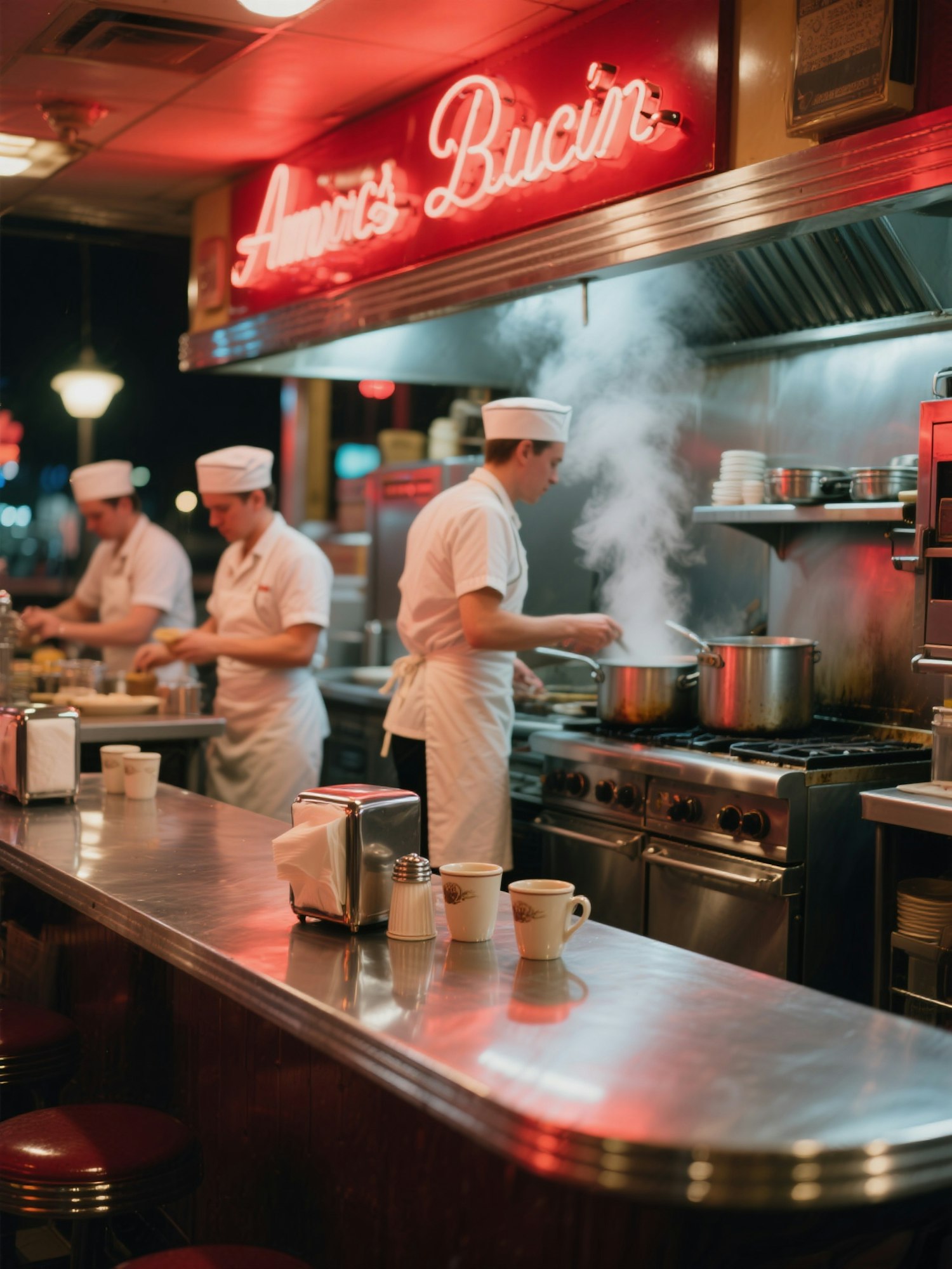 The vintage diner kitchen bustling with activity behind the counter at night, steam rising, cooks in retro uniforms moving efficiently. The warm light spills onto the diner counter with a neon red glow in the background. The scene balances nostalgic ambiance with the energetic heartbeat of diner life.