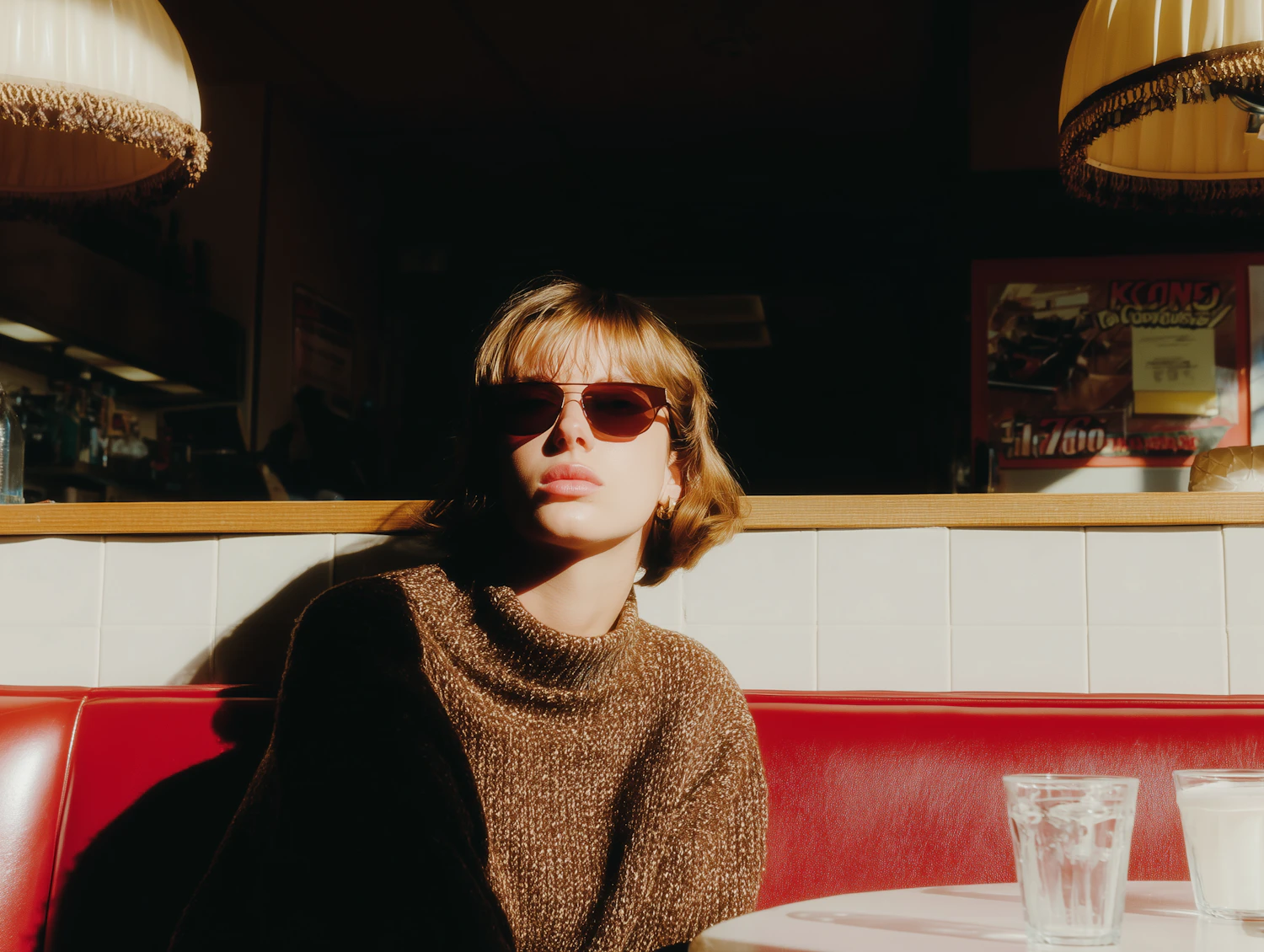 A stylish woman in sunglasses sits in a retro diner booth, bathed in warm sunlight, with a nostalgic and serene ambiance.