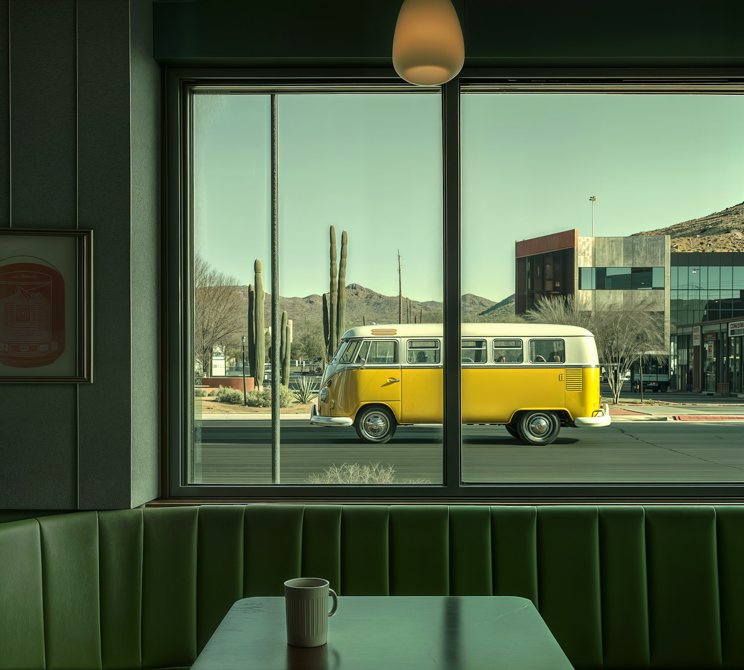 Retro diner interior with green booths, a mug on the table, and a yellow vintage VW van parked outside against a desert backdrop.