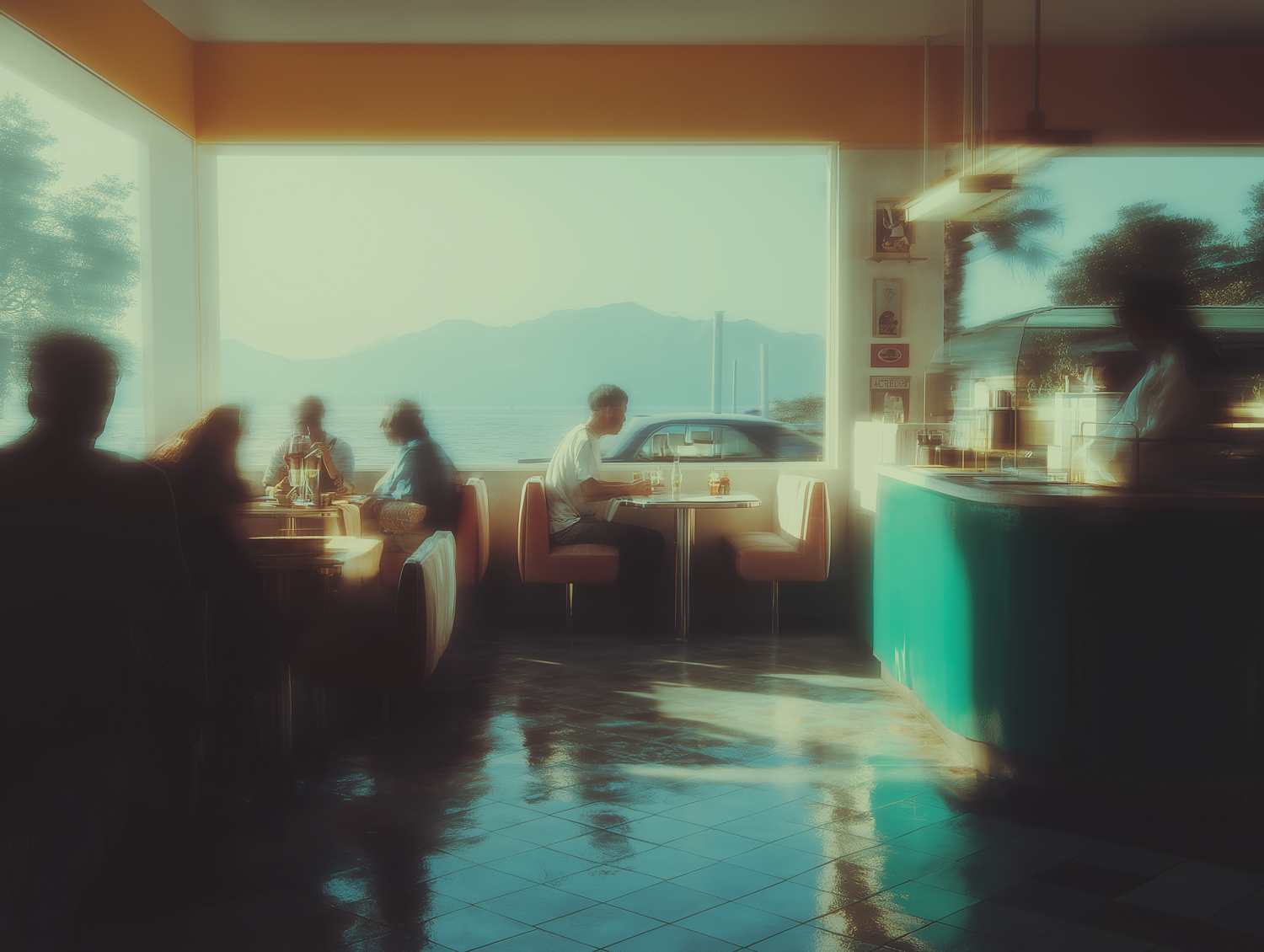 A retro diner with pastel decor, patrons enjoying meals, and a scenic mountain view through large windows. Warm and nostalgic ambiance.