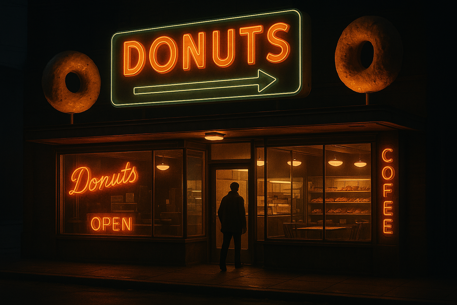 Retro donut shop at night with glowing neon signs, a warm interior, and a lone figure outside. Perfectly nostalgic and cinematic.