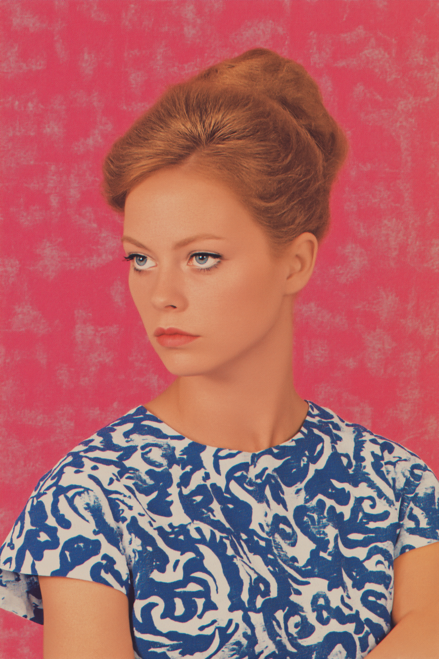 A woman with styled hair and a patterned dress poses against a vibrant pink background, showcasing a retro-inspired aesthetic.