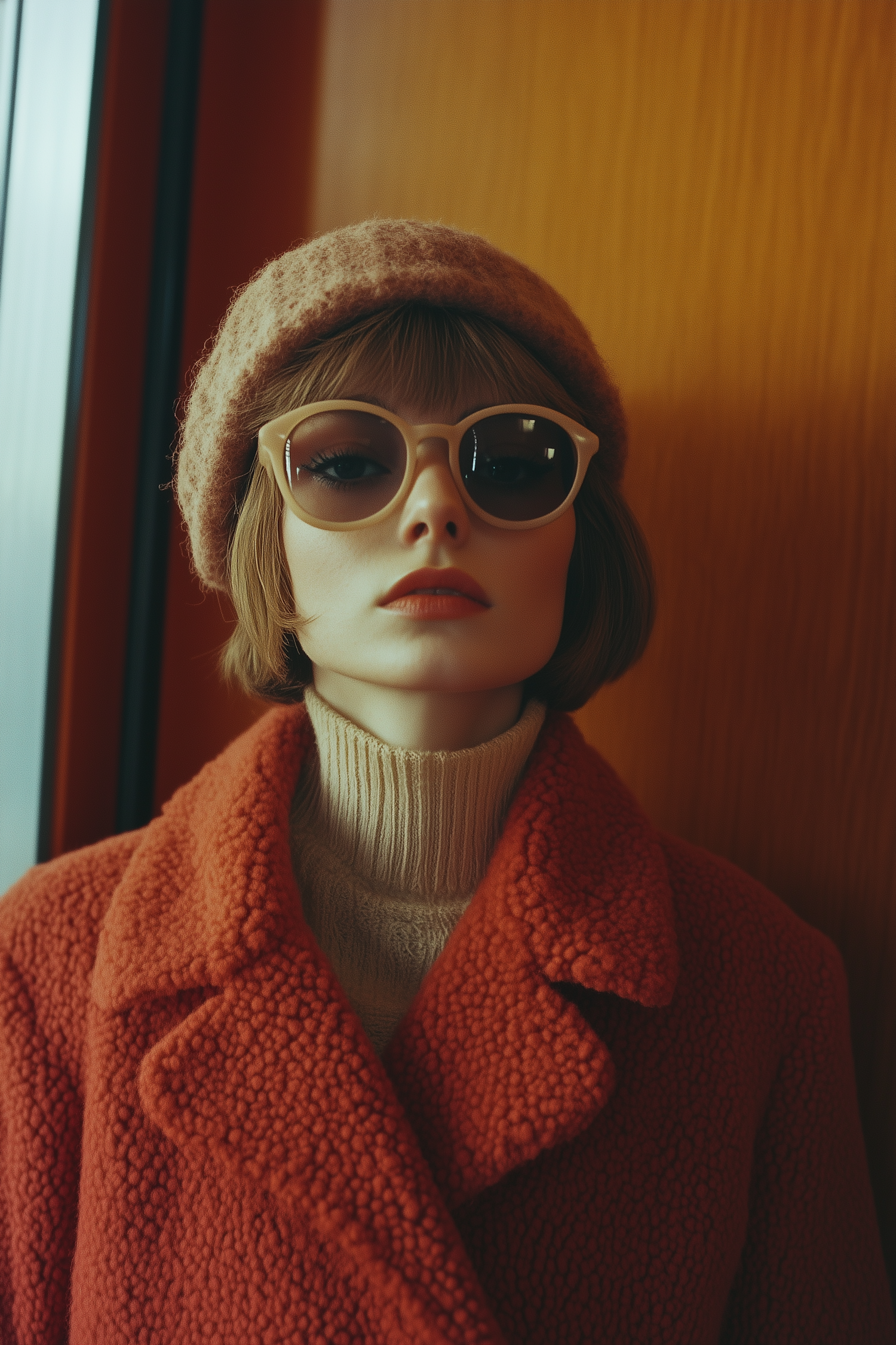 Retro-chic woman in orange coat, beige beret, and sunglasses against a warm wooden background, exuding elegance and confidence.