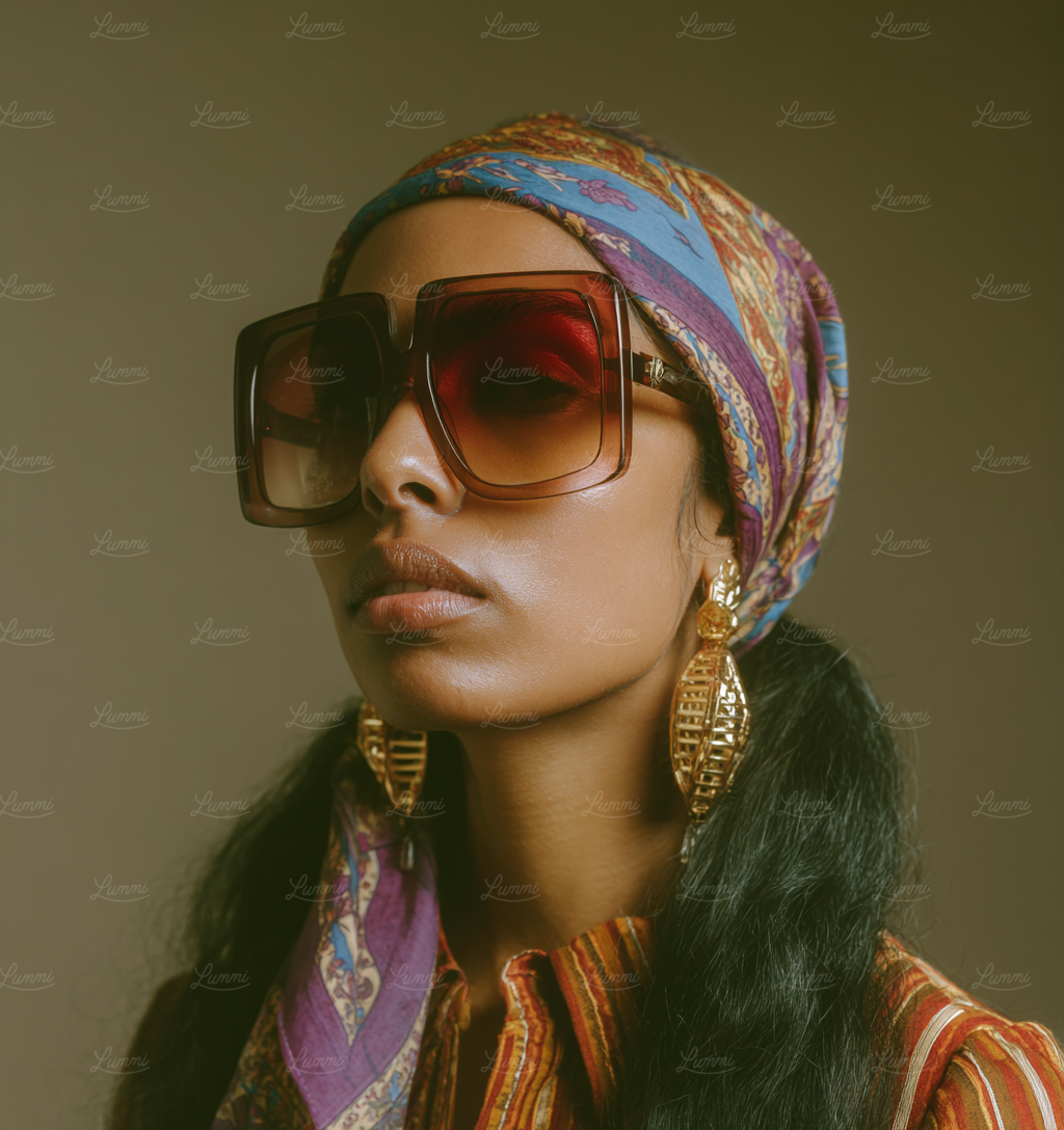 Retro-inspired portrait of a person in oversized sunglasses, a colorful headscarf, and gold earrings, exuding bold and stylish vibes.