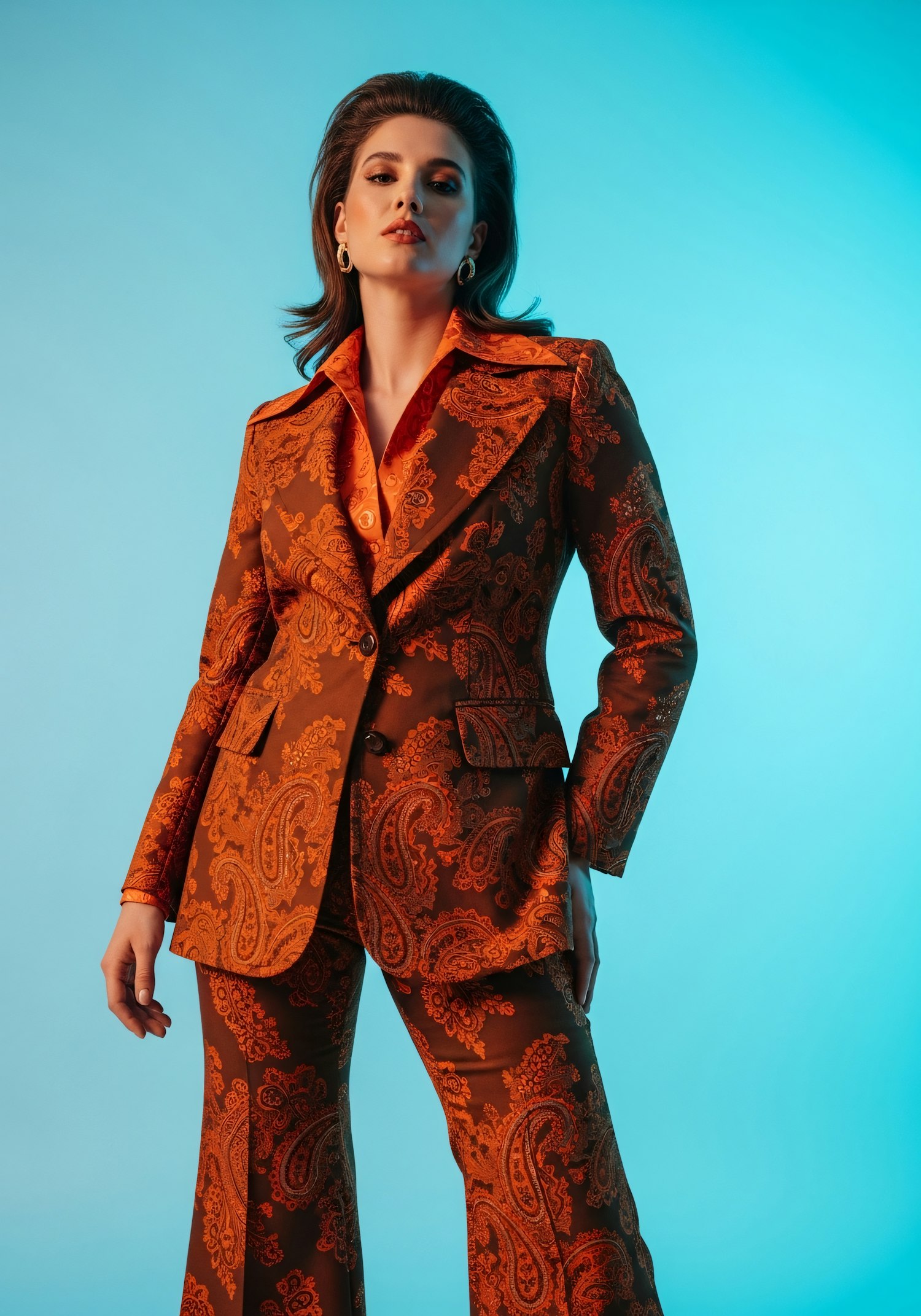 A person in a retro paisley suit poses confidently against a blue background, showcasing vintage-inspired fashion and style.