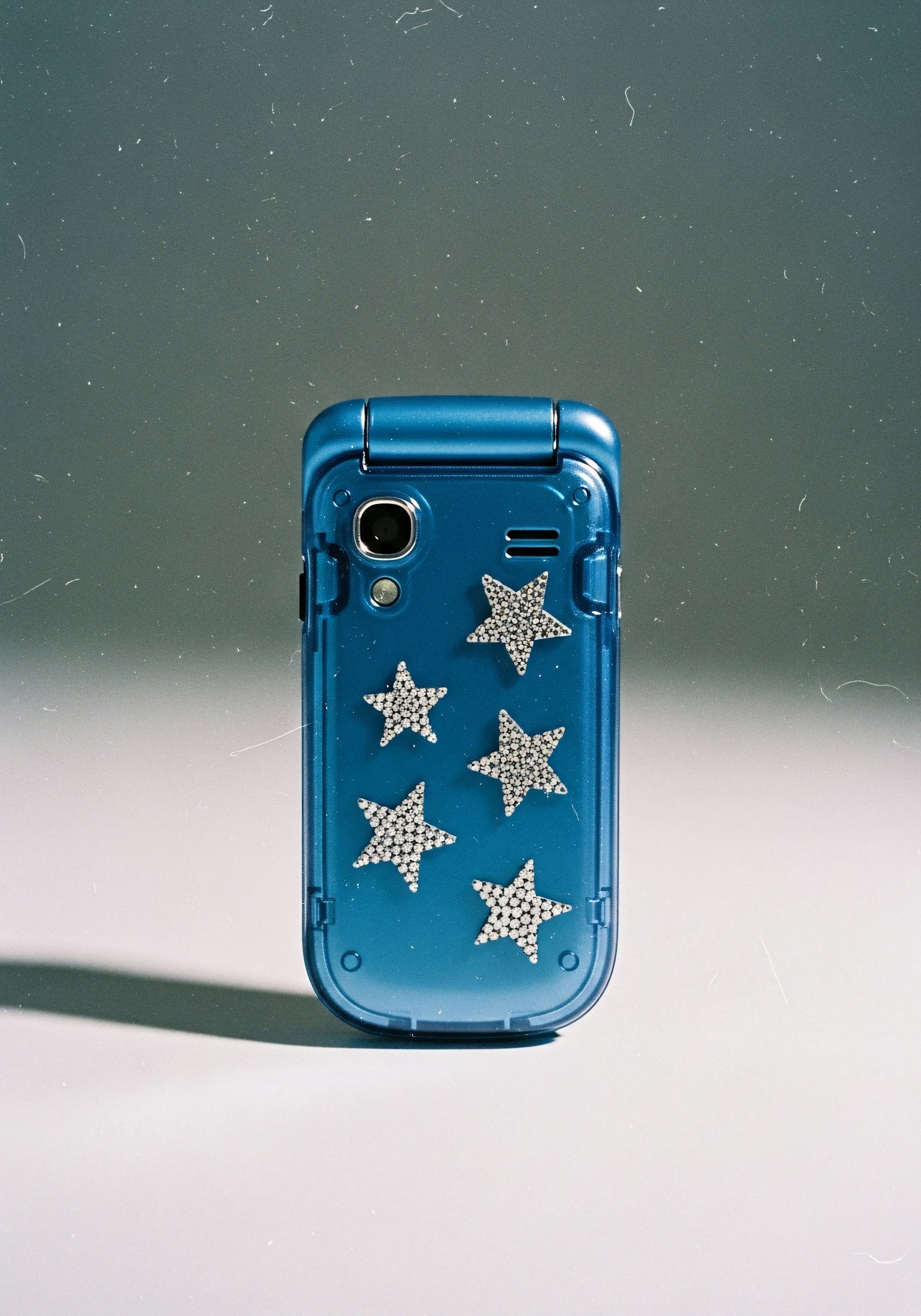 A blue flip phone with sparkling star decorations, set against a gradient background, showcasing a nostalgic and artistic aesthetic.