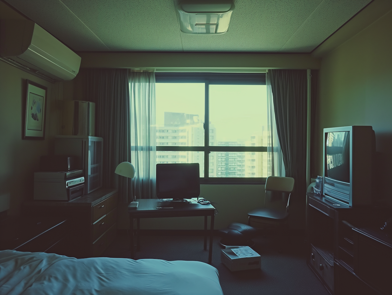 Dimly lit hotel room with a large window, bed, desk, computer monitor, TV, and city view. Nostalgic ambiance with modern furnishings.