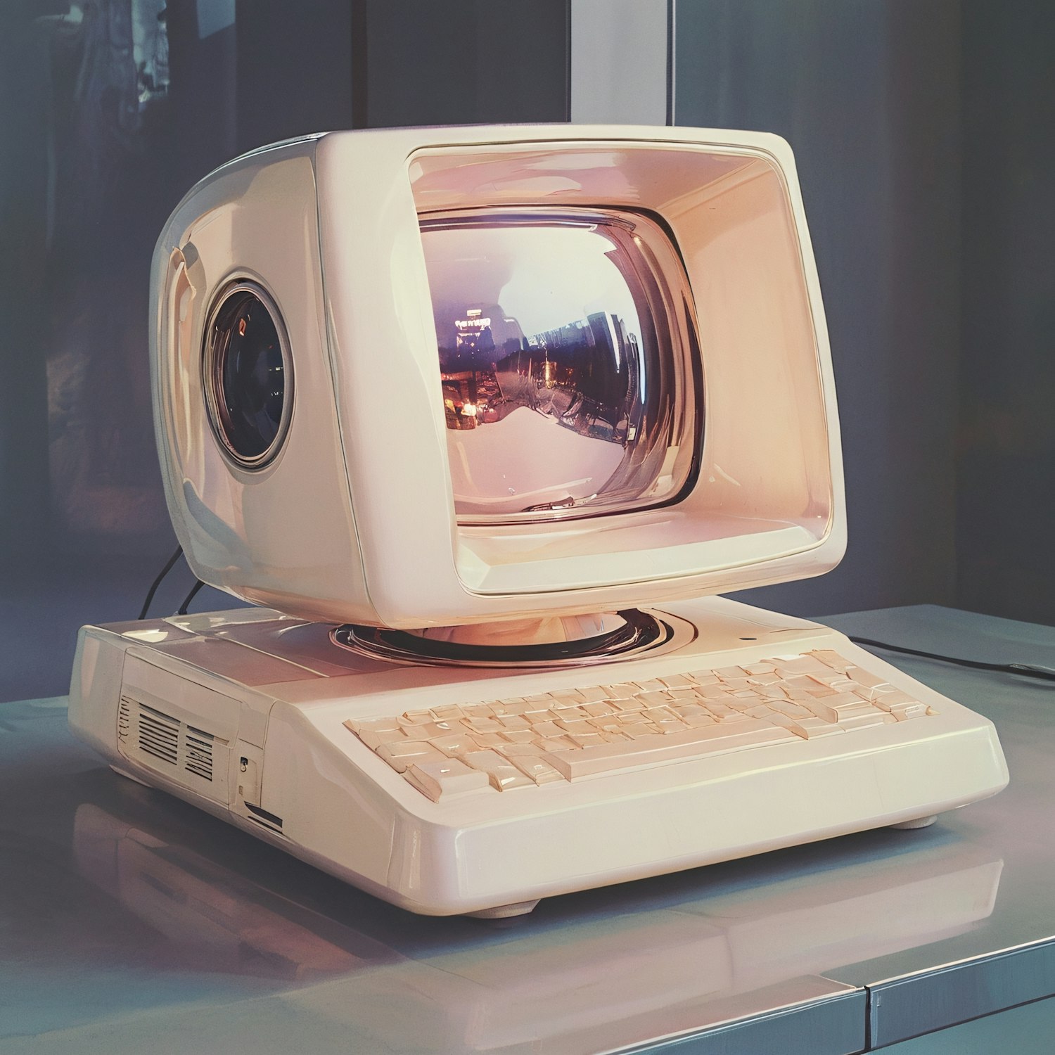 Retro-futuristic computer with a glossy, rounded monitor and cream-colored casing on a sleek surface.