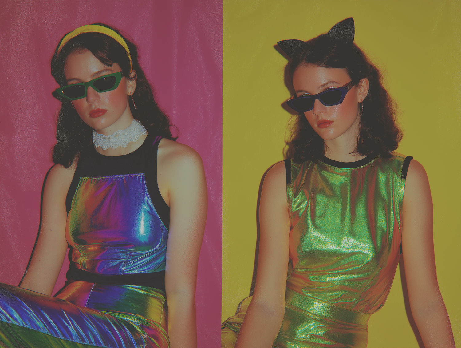 Two women in vibrant, iridescent outfits and sunglasses, posing against bold pink and yellow backdrops for a retro-futuristic vibe.