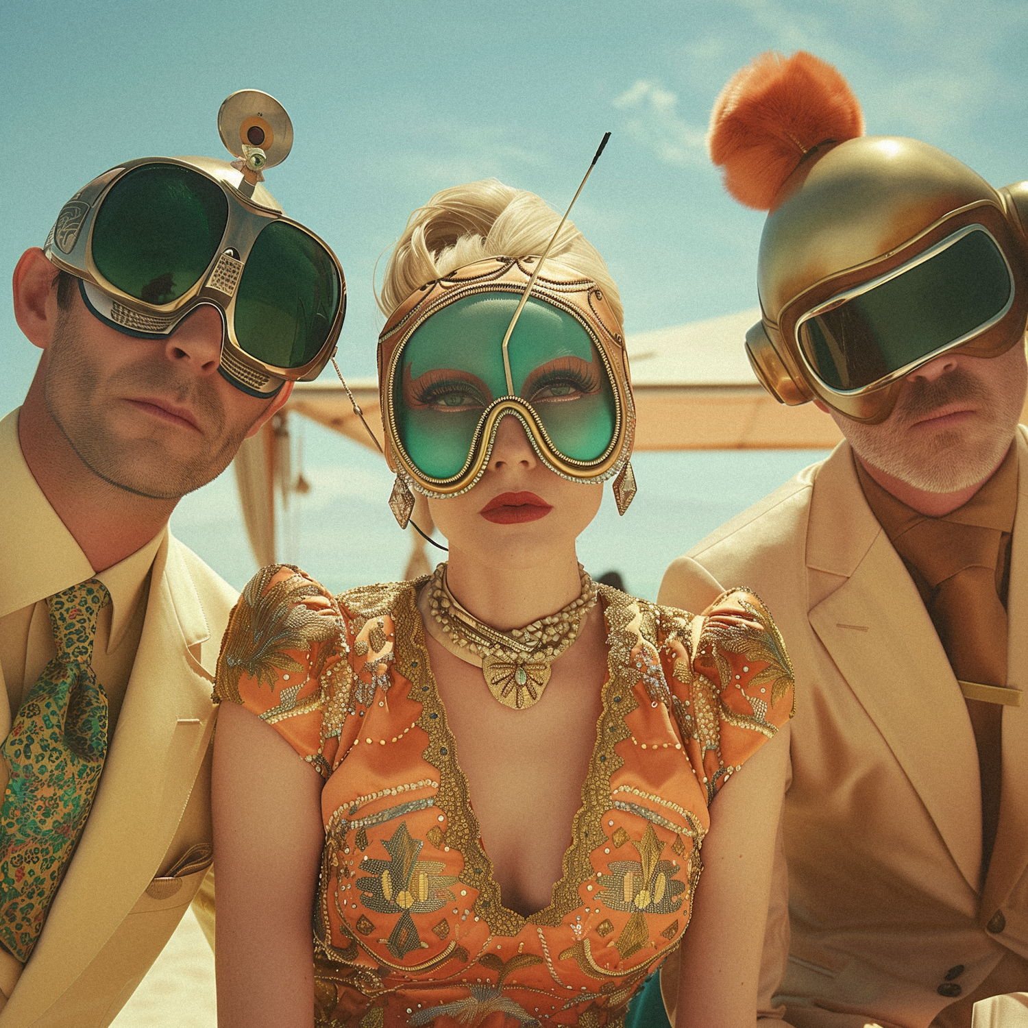 Three people in retro-futuristic outfits with unique helmets and goggles, set against a beach backdrop.