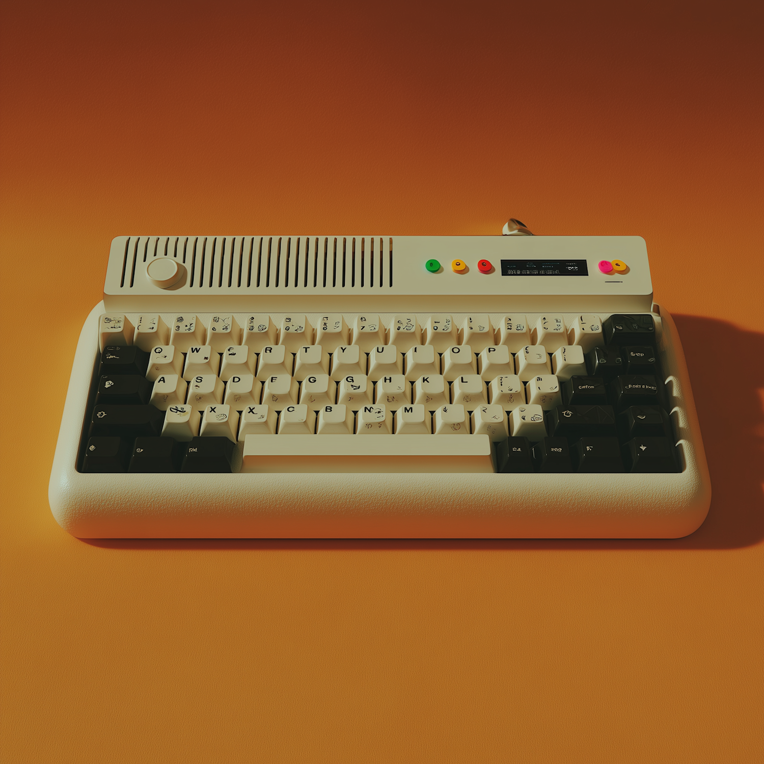 Retro-style keyboard with beige and black keys, colorful buttons, and a small display, set against a warm orange background.