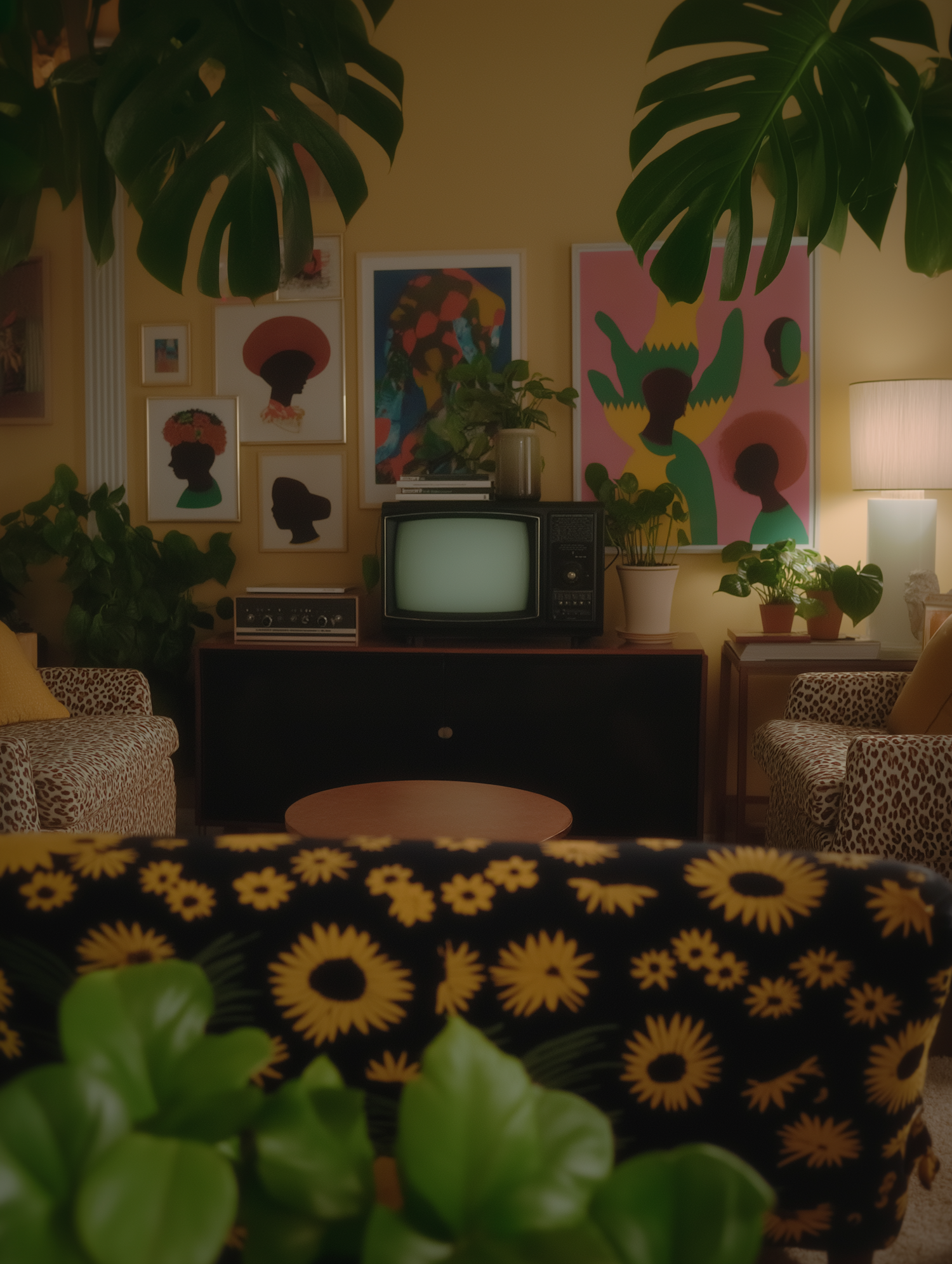 Retro living room with vintage TV, leopard print chairs, vibrant art, and lush plants in a cozy yellow-toned setting.
