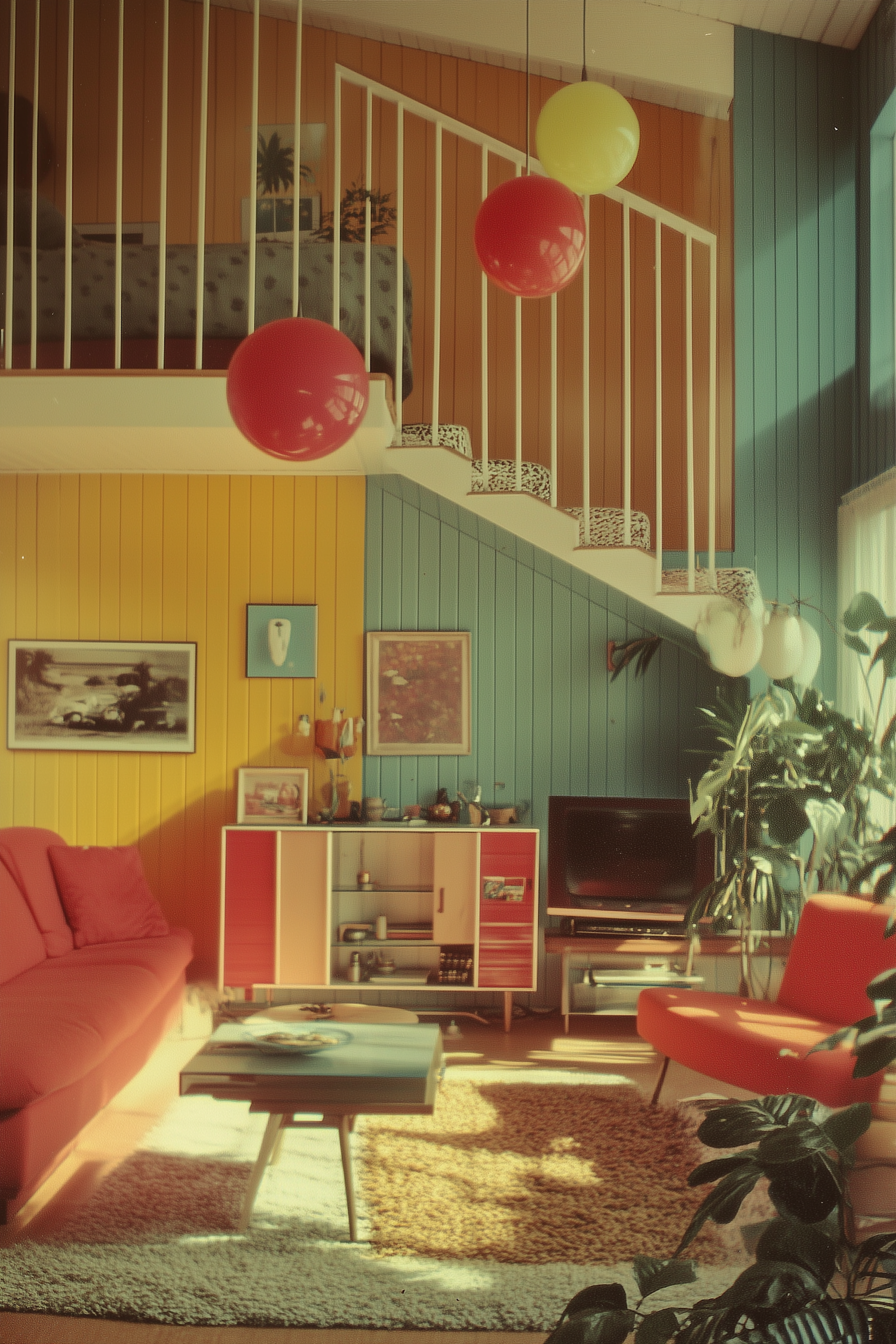 Retro living room with bold colors, vintage decor, and playful balloons. Features a red sofa, teal and yellow walls, and a loft area.