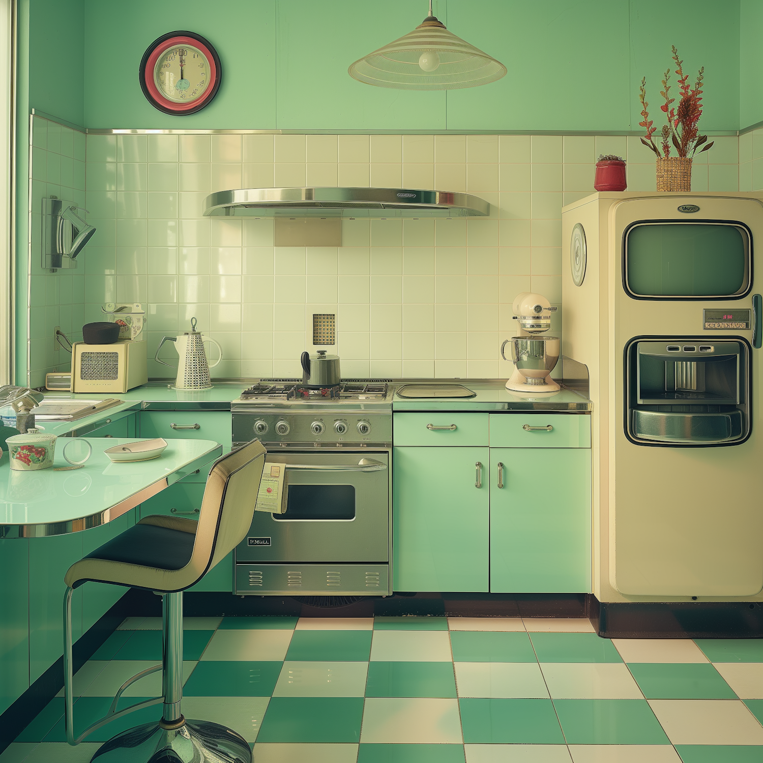 Retro kitchen with mint green cabinets, vintage appliances, and checkered floor. Nostalgic charm with a cream fridge and classic decor.