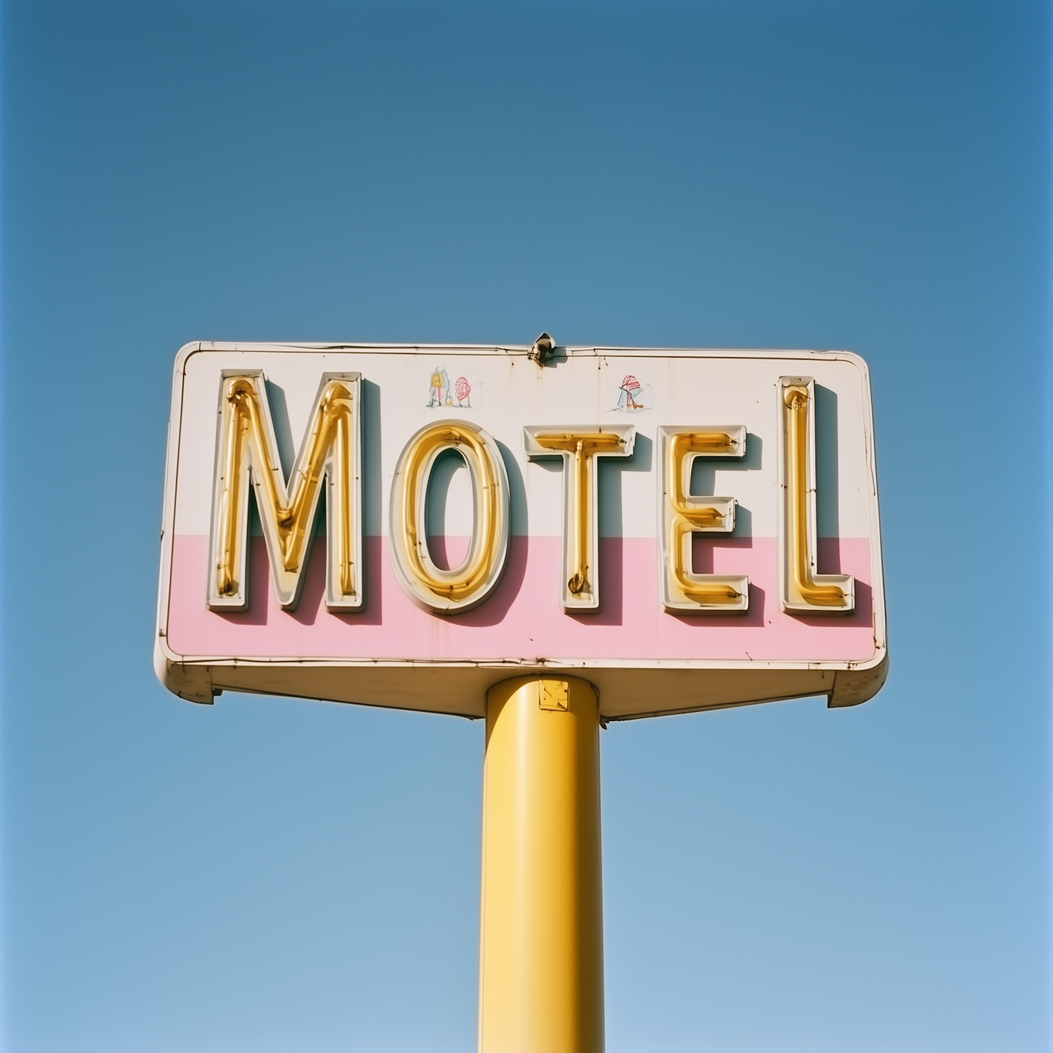 Retro motel sign with bold yellow neon letters, a pink stripe, and playful illustrations, set against a clear blue sky.