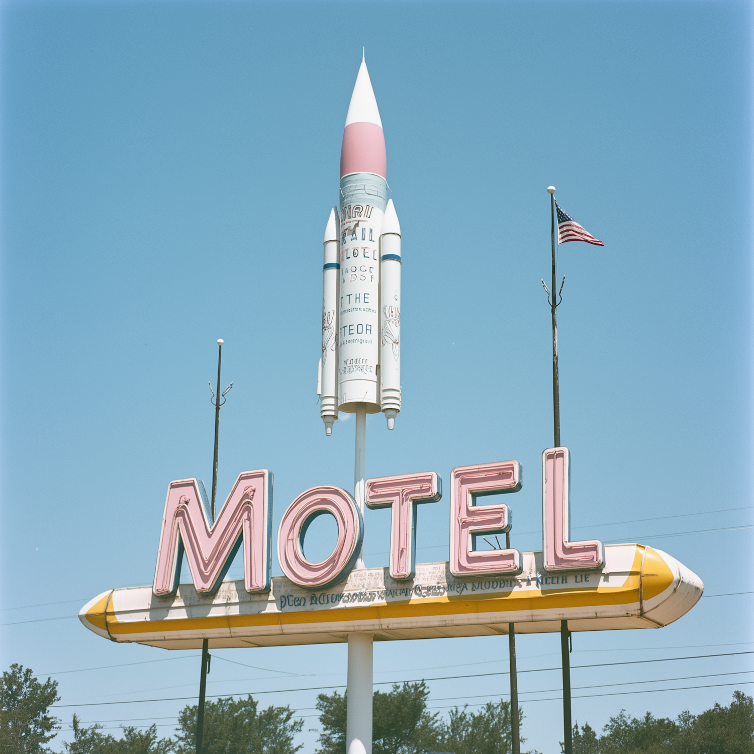 Retro motel sign with pink neon letters and a rocket design, set against a clear blue sky with an American flag nearby.
