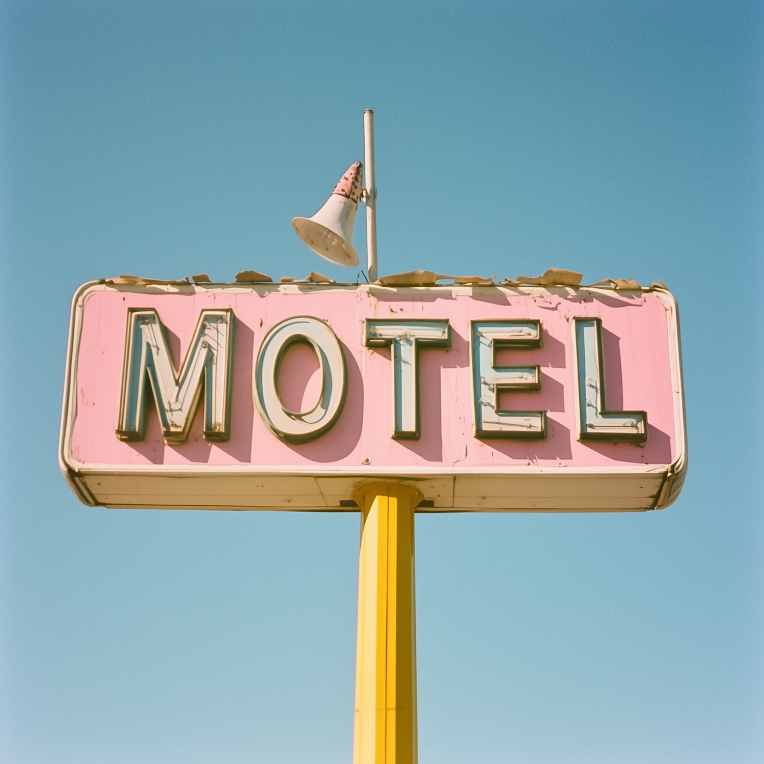 Retro pink motel sign with vintage lettering, a yellow pole, and a clear blue sky. Perfect for nostalgic or Americana-themed visuals.