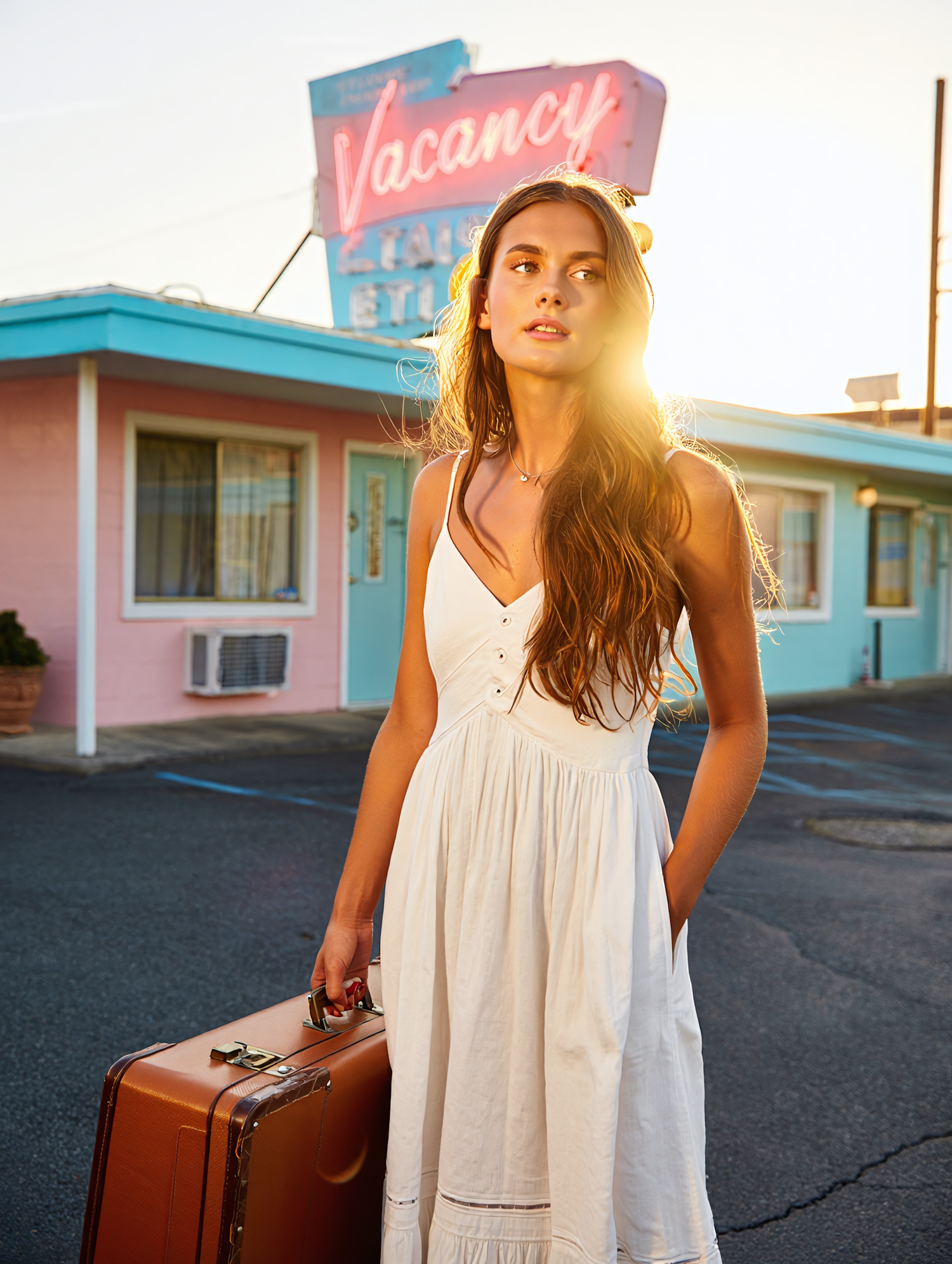 A young woman in a white dress with a vintage suitcase stands by a retro motel under warm sunlight, evoking a nostalgic travel vibe.