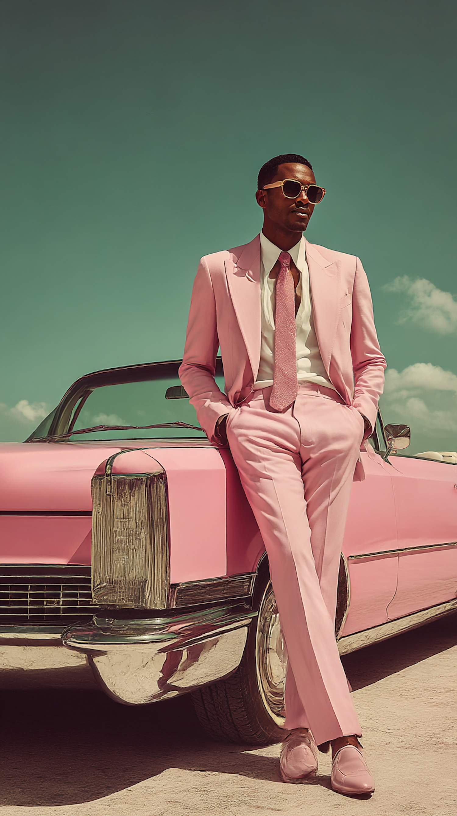 Stylish man in a pink suit leaning on a vintage pink convertible under a clear sky, exuding retro vibes and elegance.