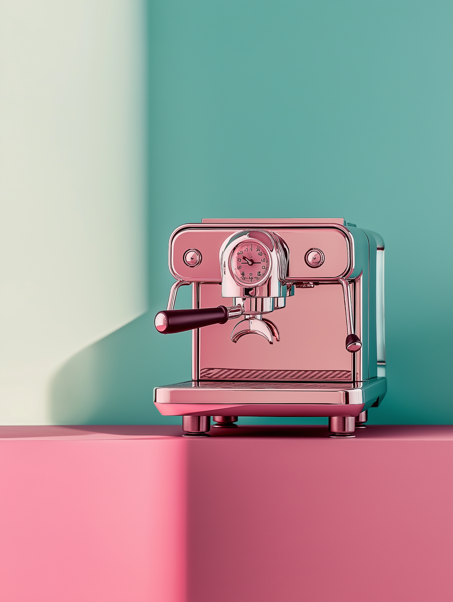 Stylish pink metallic espresso machine with retro design, set against a teal and pink background for a modern, vibrant aesthetic.