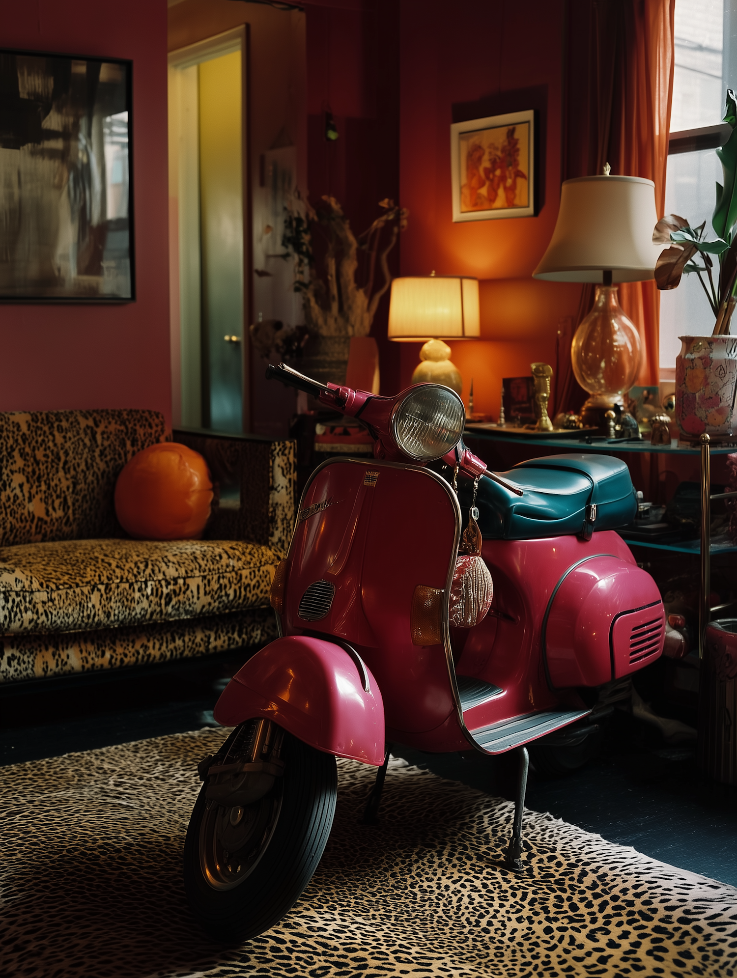 Retro pink scooter indoors on a leopard-print rug, surrounded by eclectic decor, warm lighting, and vintage furniture for a cozy vibe.