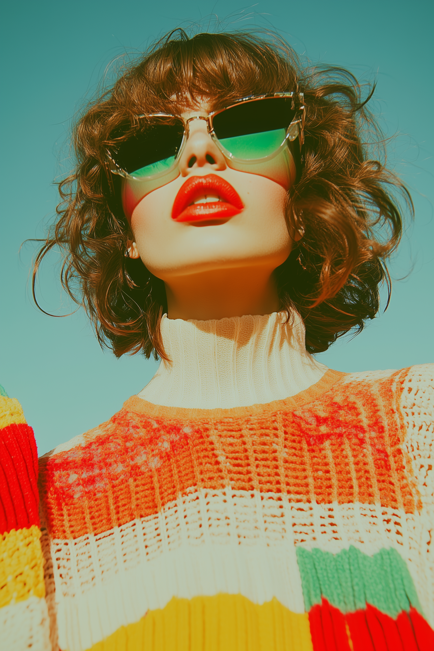 Retro-inspired portrait of a woman in bold sunglasses, red lipstick, and a colorful sweater against a teal sky.