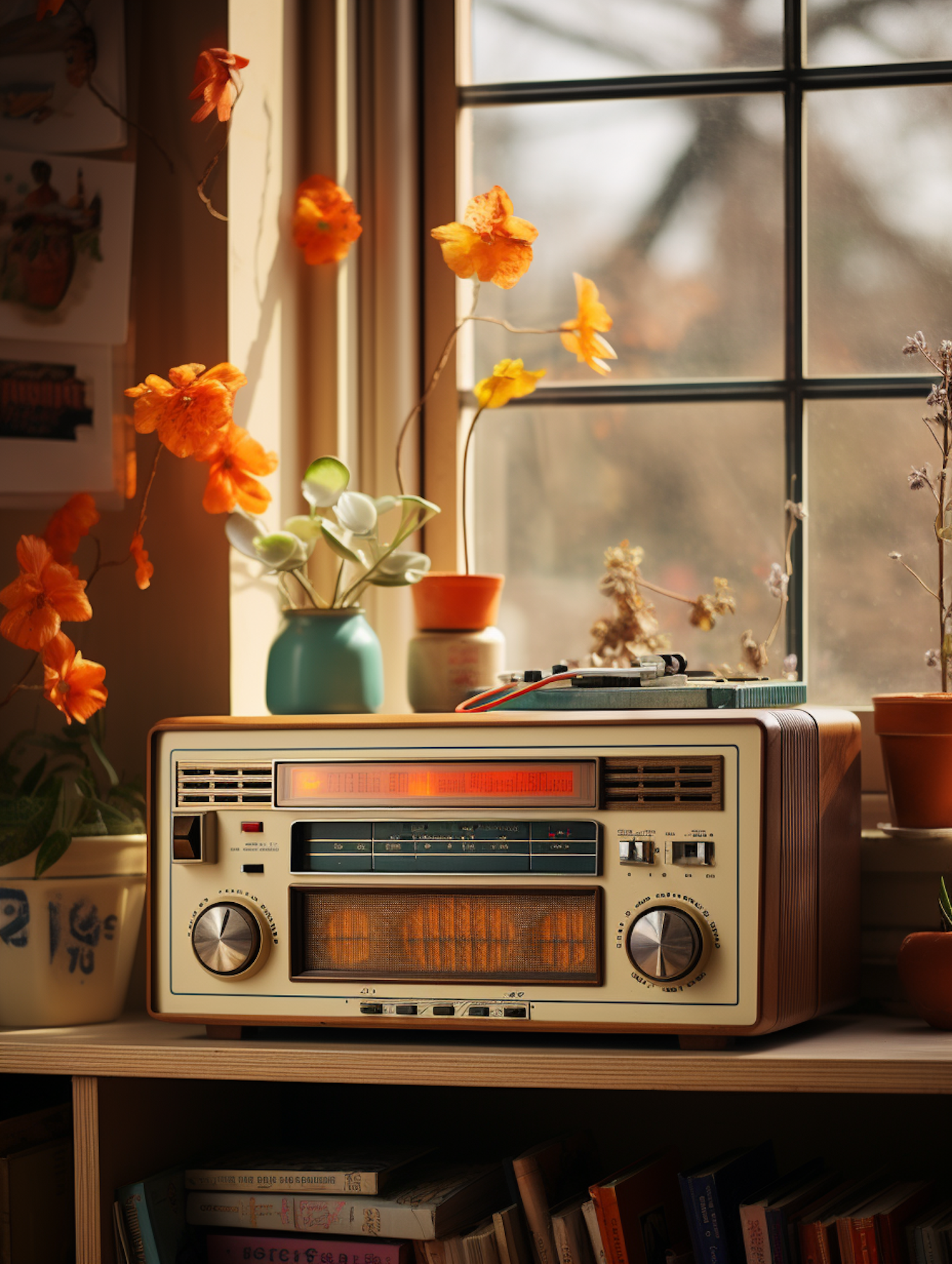 Vintage radio on a wooden shelf with colorful flowers and books, bathed in warm sunlight through a window.