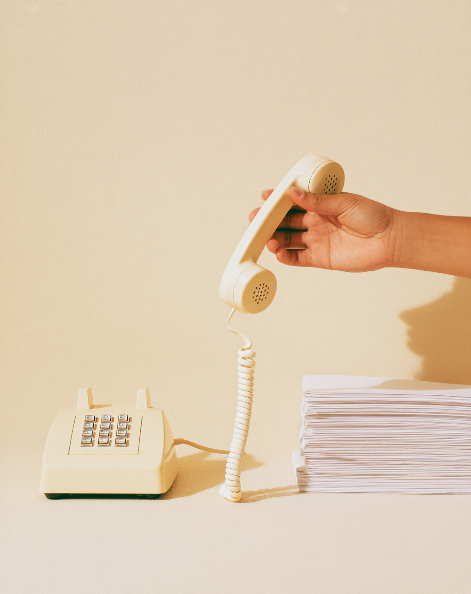 A minimalist scene featuring a vintage rotary phone, a stack of papers, and a hand lifting the receiver, all set against a beige backdrop.