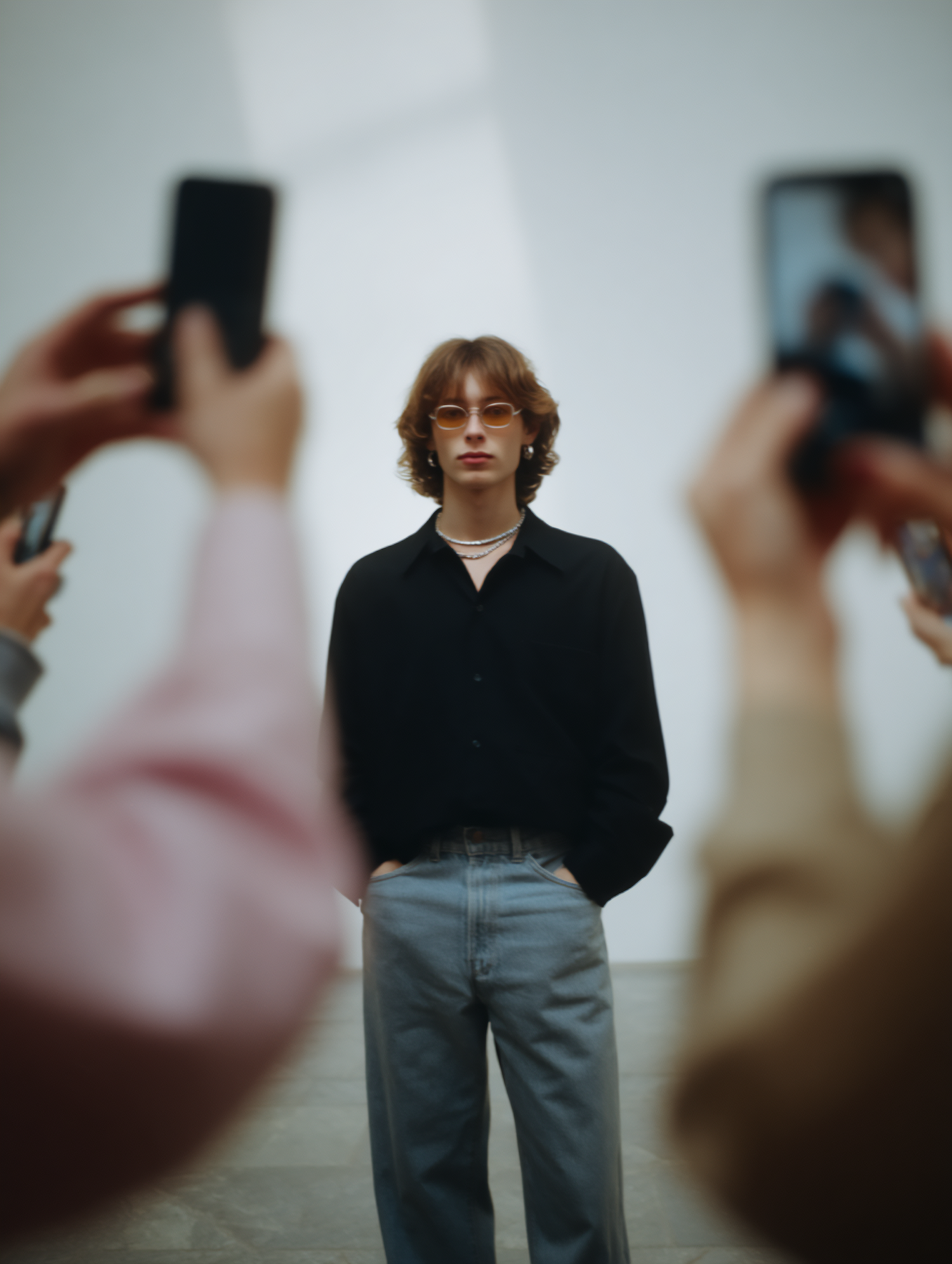 Stylish individual in black shirt and jeans, accessorized with orange sunglasses, surrounded by blurred hands holding smartphones.