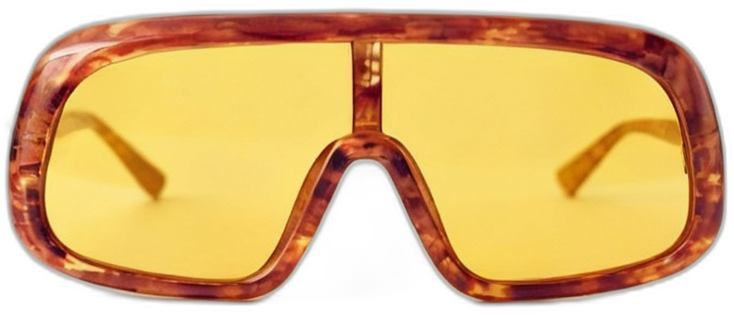 Retro-style sunglasses with a marbled brown frame and vibrant yellow lenses, featuring a bold and unique design.