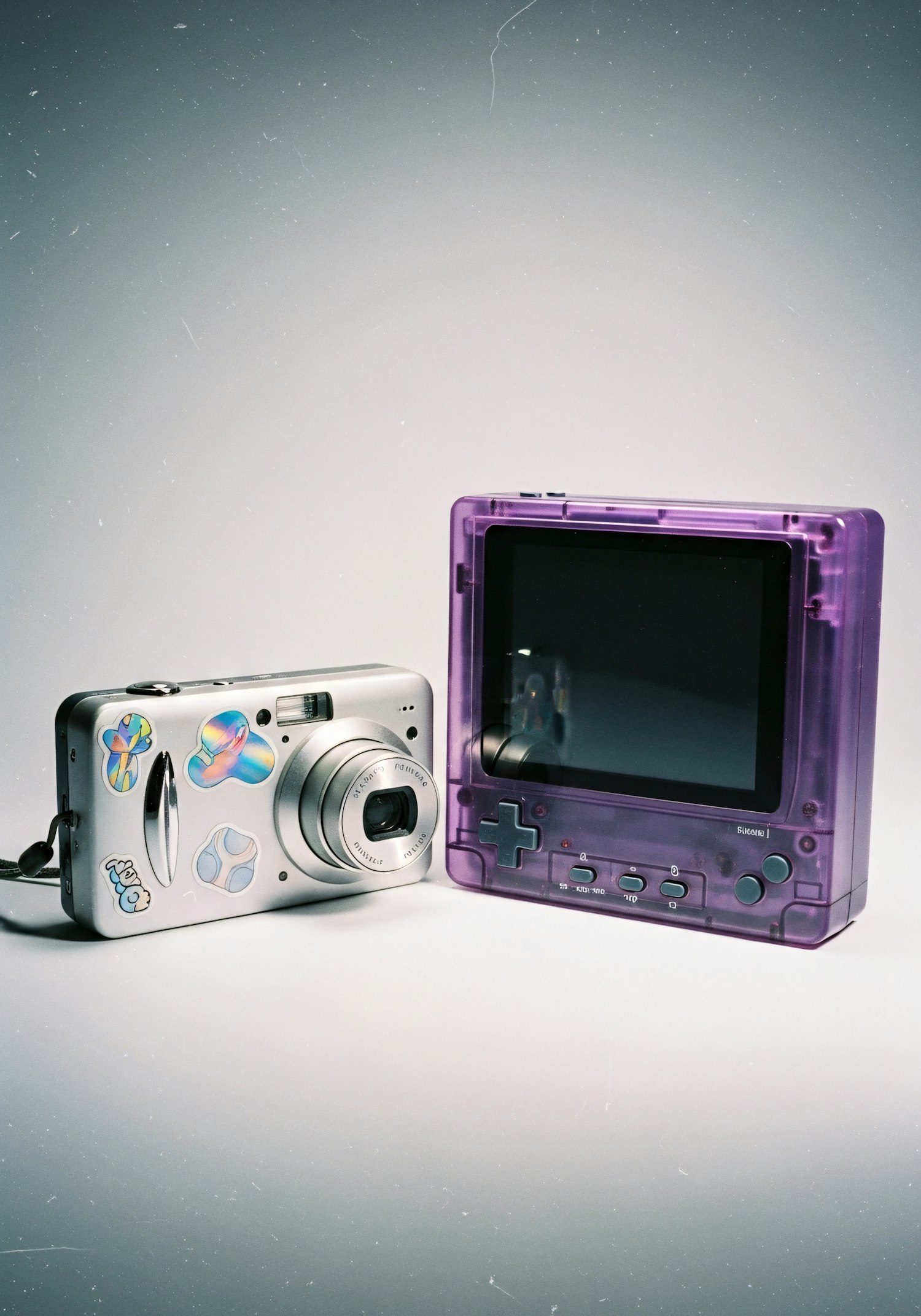 A silver digital camera with stickers and a purple retro-style electronic device on a clean gradient background.