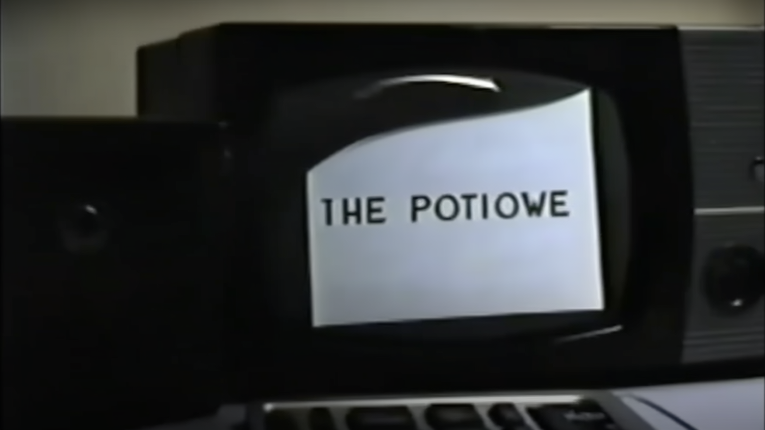 A retro TV screen displaying 'THE POTIOWE' in bold text, evoking a nostalgic vibe with its vintage design and dimly lit setting.