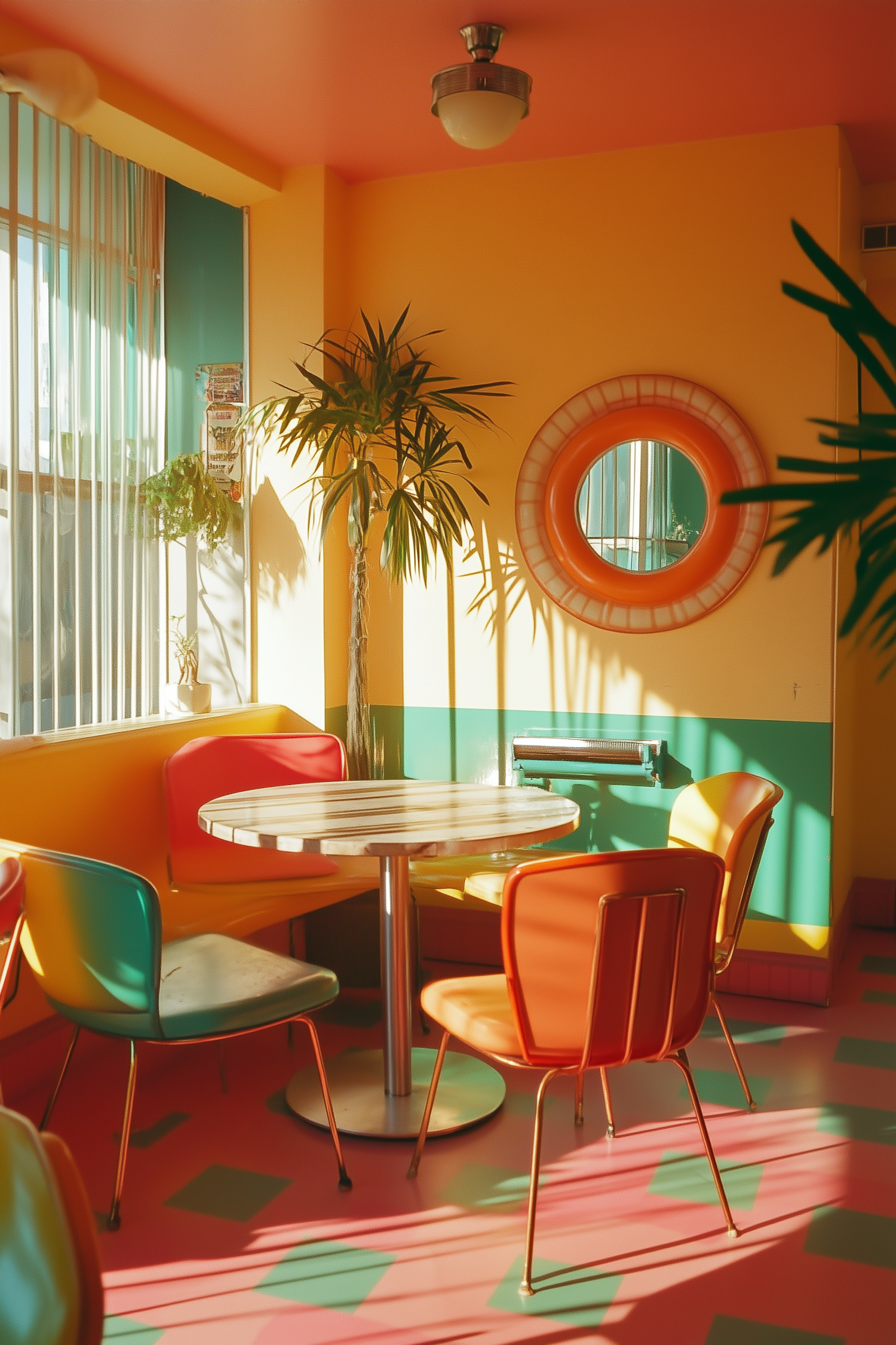 Retro diner interior with colorful chairs, round table, and vibrant decor. Sunlight casts playful shadows, creating a nostalgic atmosphere.