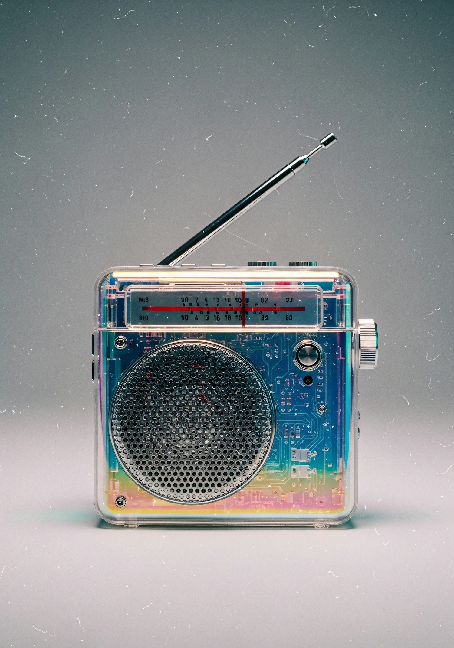 A retro-style transparent radio showcasing its internal circuitry and a classic analog design with a modern aesthetic.