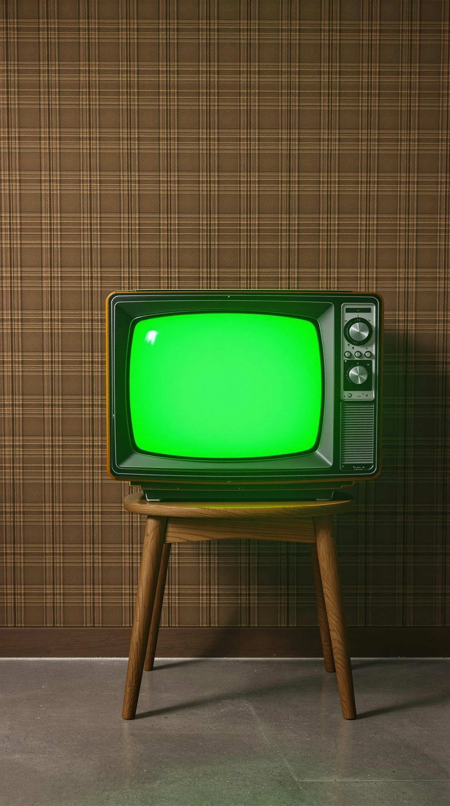 A vintage television with a bright green chroma screen sits on a mid-century wooden stool, centered in the frame. The background is a retro brown plaid wallpaper, evoking a 1970s aesthetic. The floor is concrete, adding a subtle industrial contrast to the warm, nostalgic setting. The TV has a rounded screen, dials on the right, and visible wear, suggesting age and character. Front-facing composition, photographed with a 50mm lens for a natural perspective. Soft, ambient lighting creates gentle shadows, enhancing the mood. Analog film grain texture adds a nostalgic, cinematic feel.