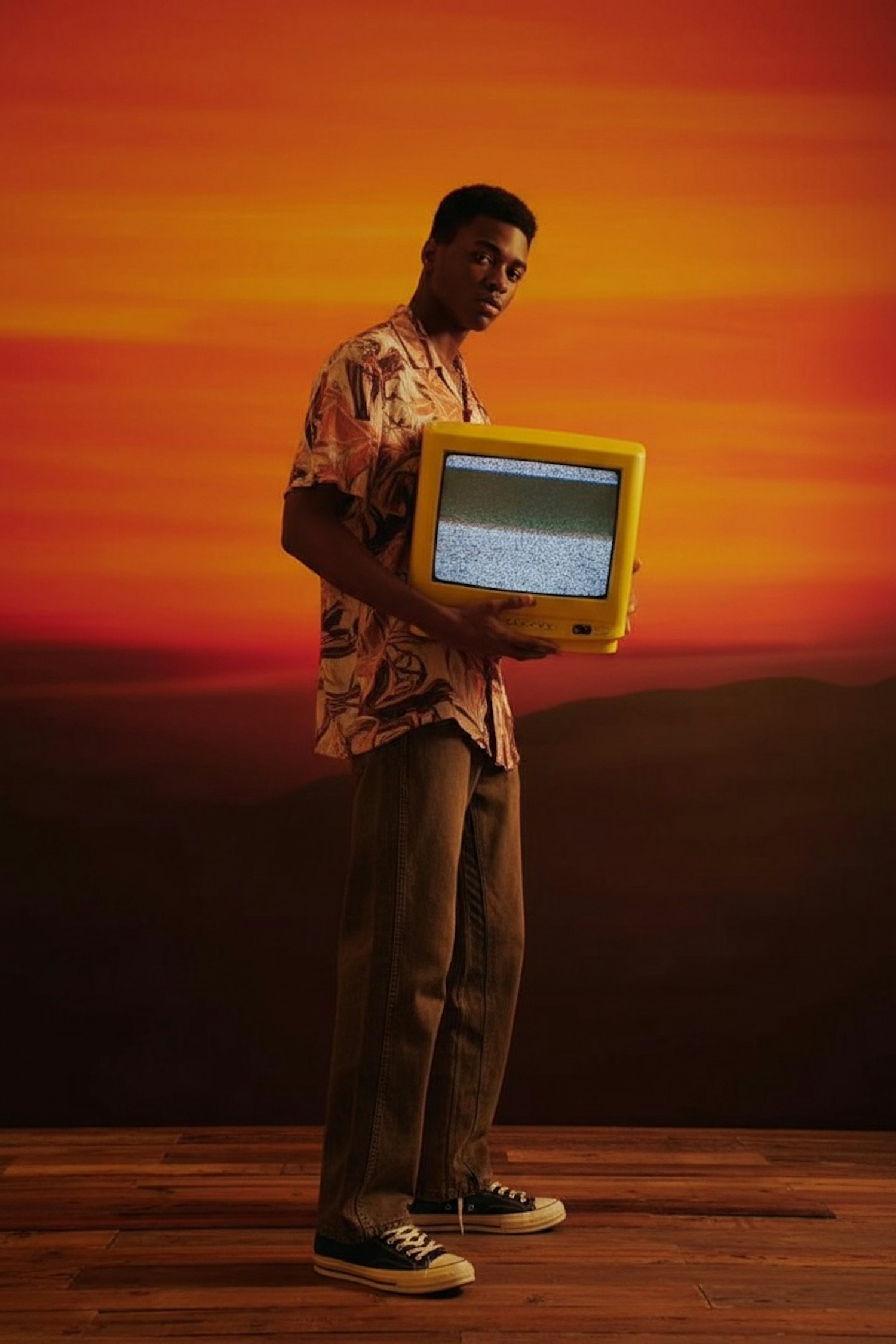 A young man holding a vintage yellow TV with static, set against a warm sunset gradient background, wearing a patterned shirt and brown pants.