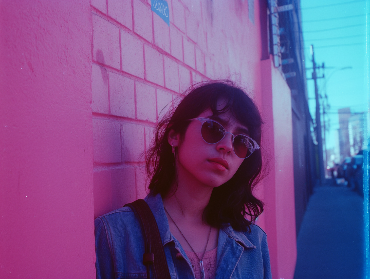 Young woman in sunglasses leans against a pink wall, wearing a denim jacket. Urban street scene with a retro color cast.