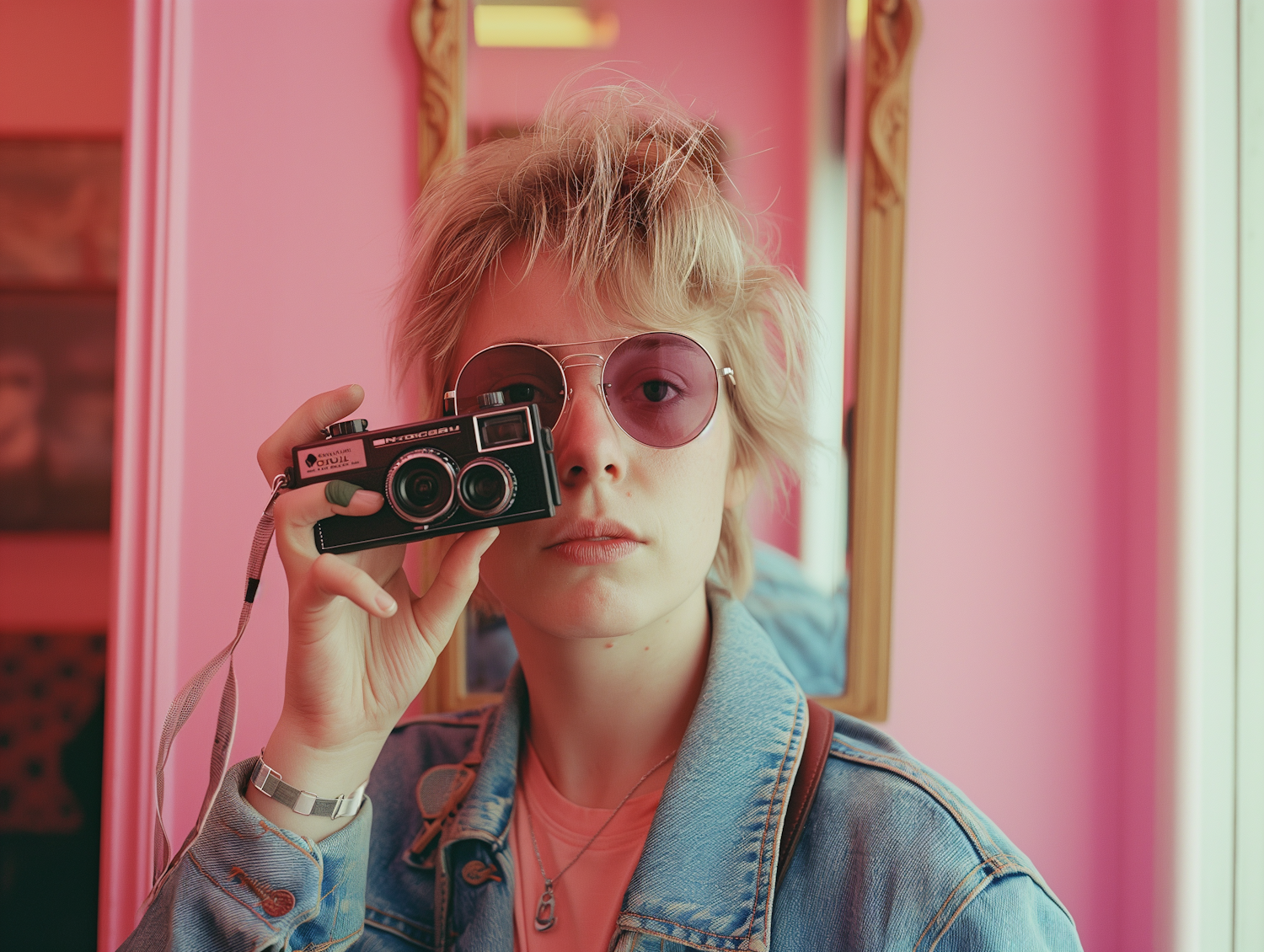 Young woman with blonde hair and pink sunglasses holding a vintage camera against a vibrant pink background.