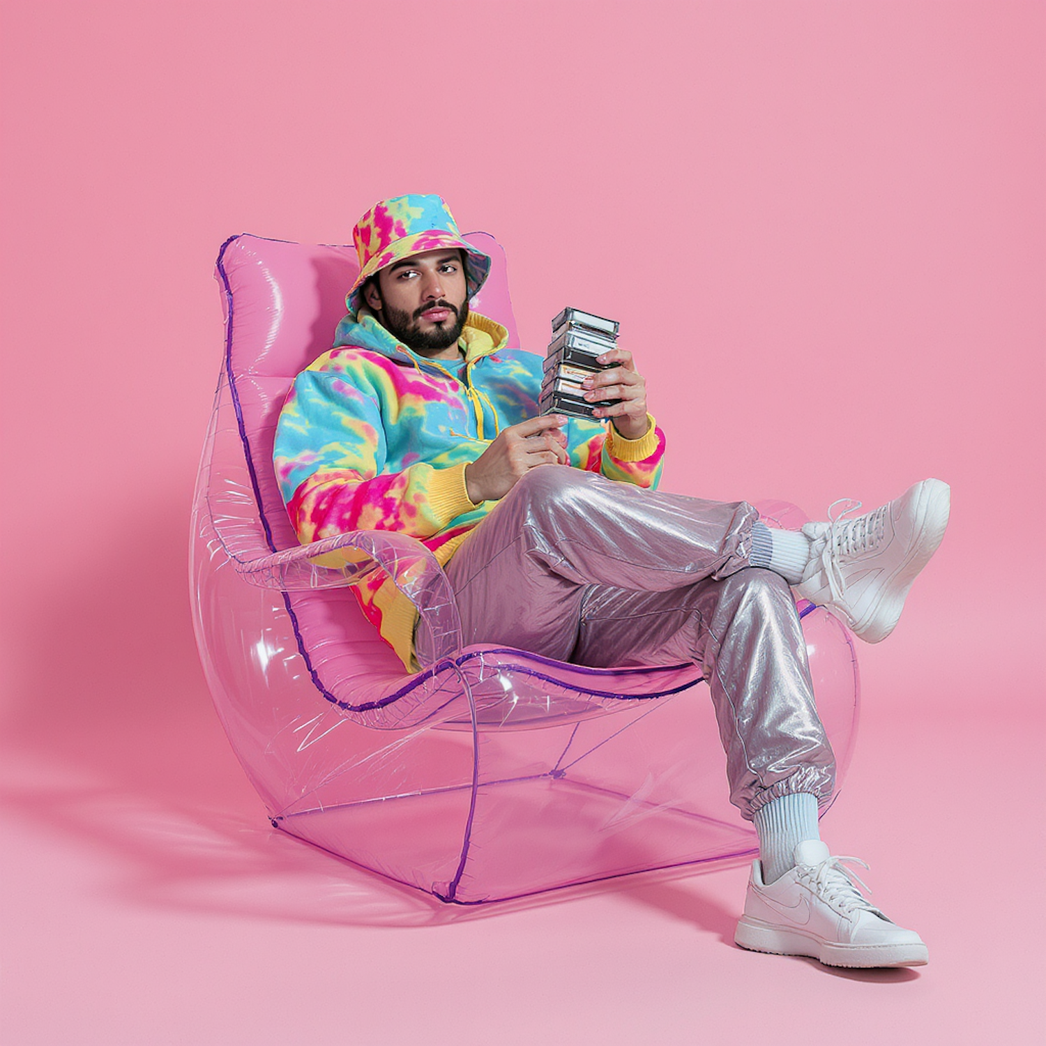 A stylish man in a tie-dye hoodie and silver pants sits on a pink inflatable chair, holding cassette tapes against a pink backdrop.