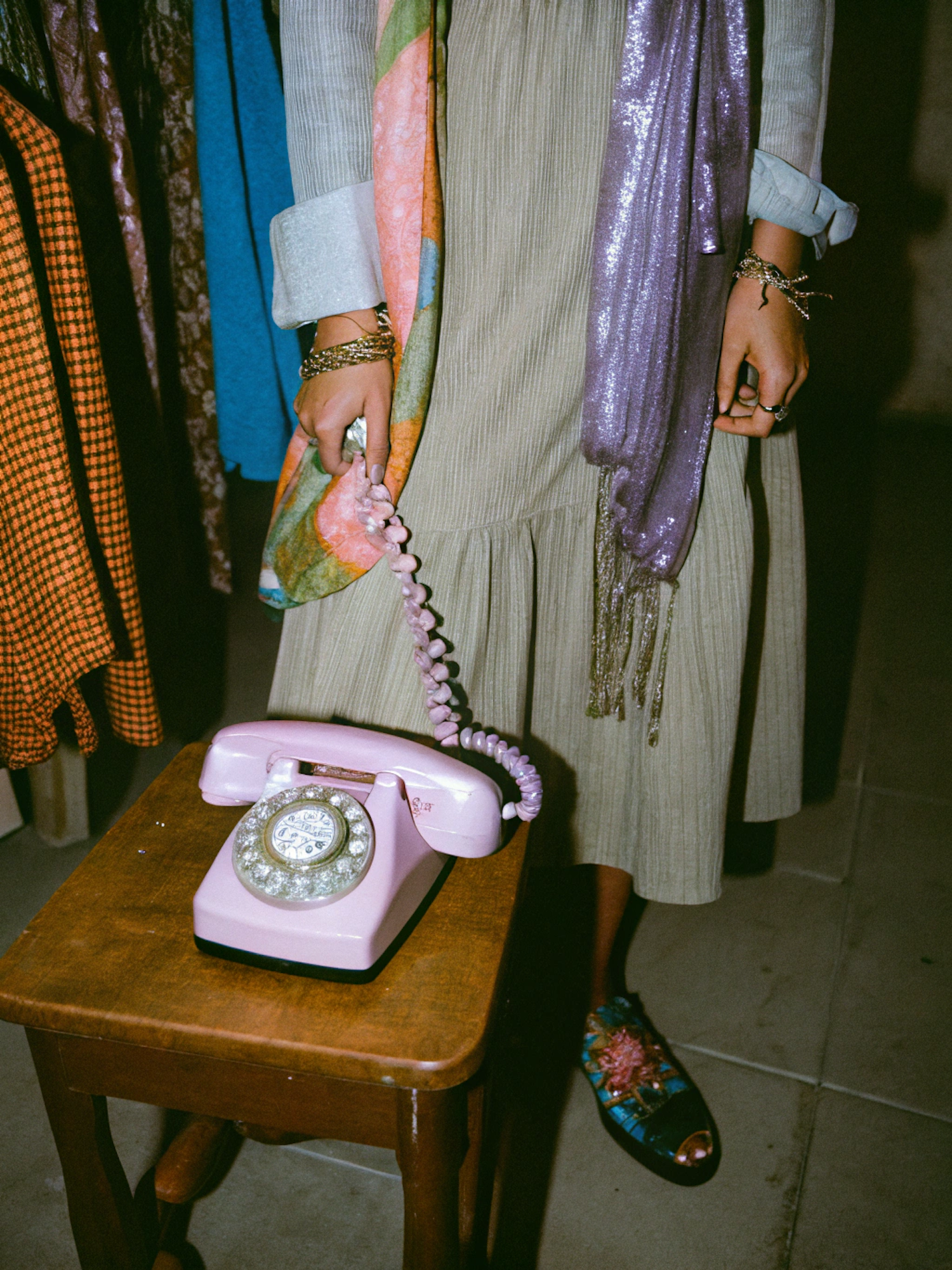 Retro vibes with a pink rotary phone, eclectic outfit, and vibrant floral shoes. Perfect mix of vintage and modern style.