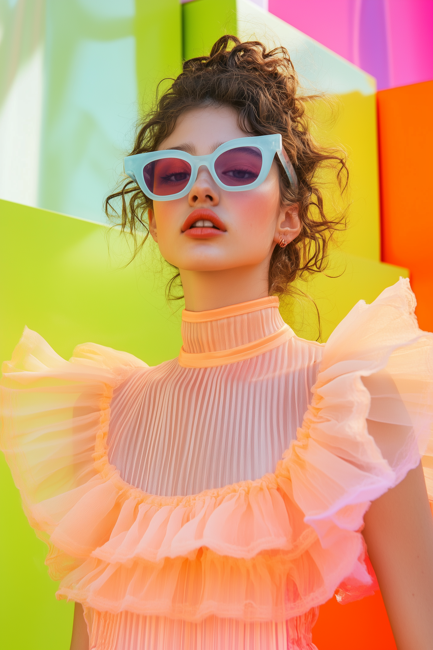 Stylish woman in pastel blue sunglasses and ruffled peach top against a vibrant neon background. Bold, colorful, and fashion-forward.