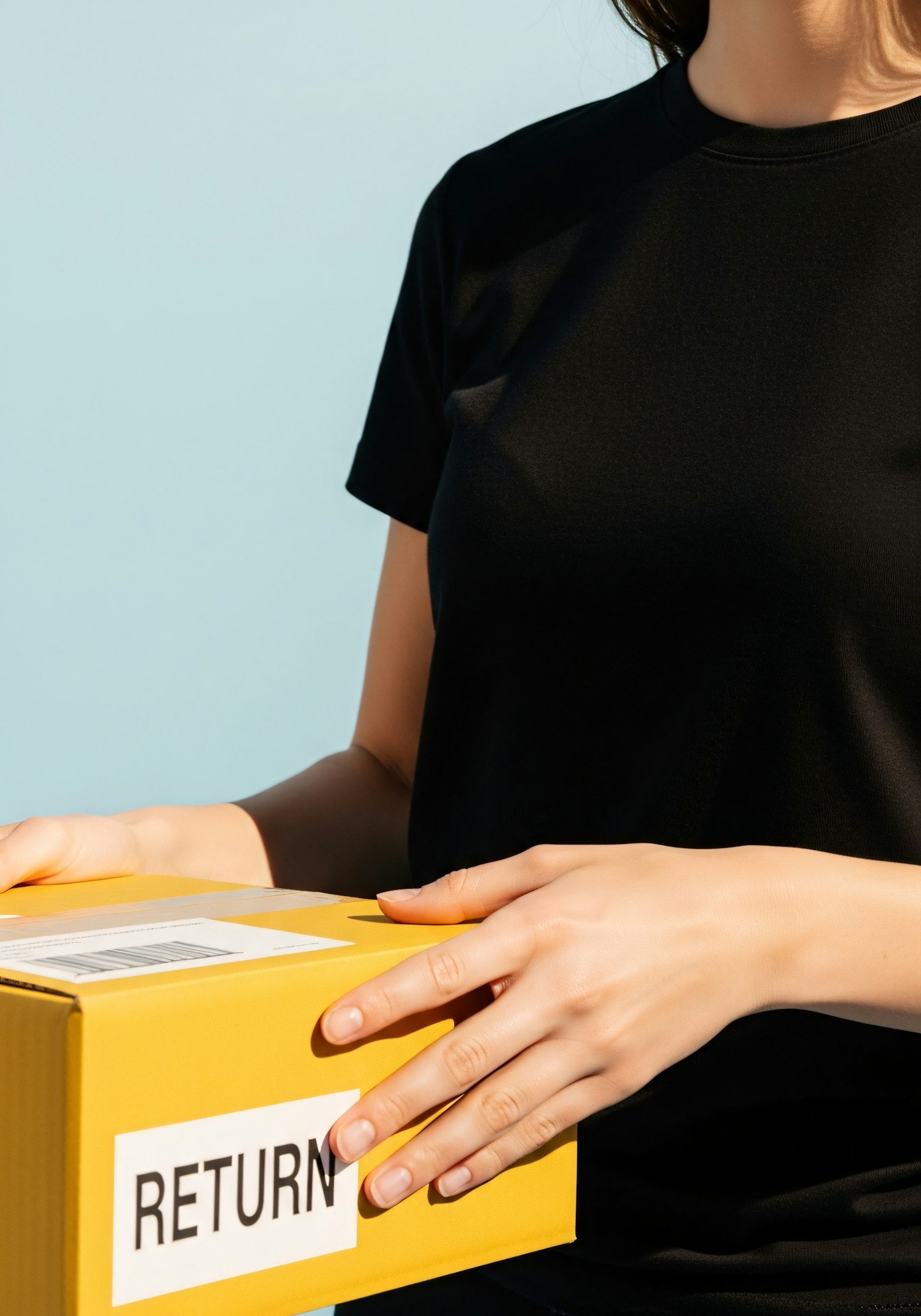 A person in a black shirt holding a yellow box labeled 'RETURN' against a light blue background, emphasizing the return process.