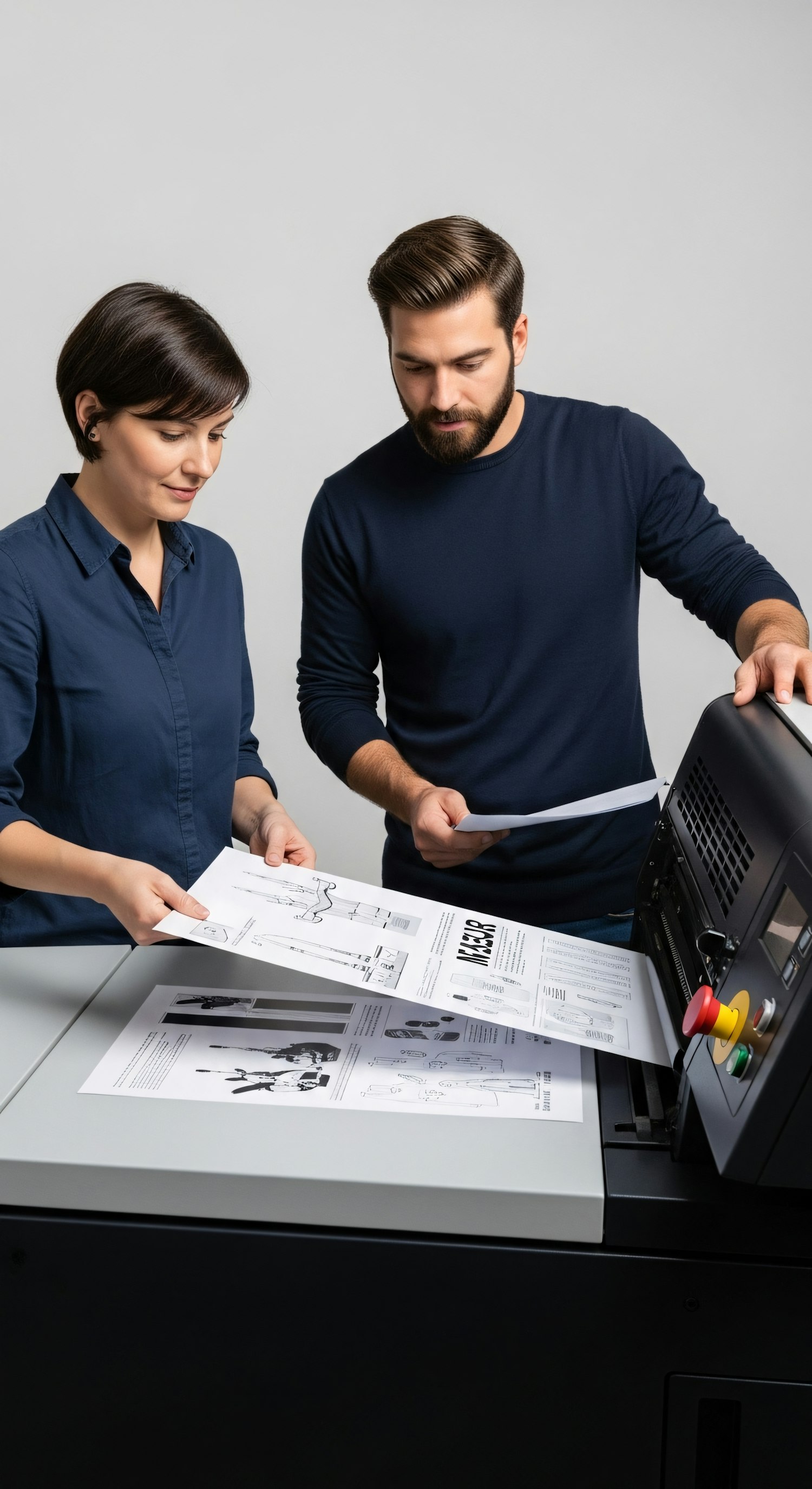 Two professionals review technical prints from a large printer, focusing on details. A modern workspace with a high-quality printing setup.