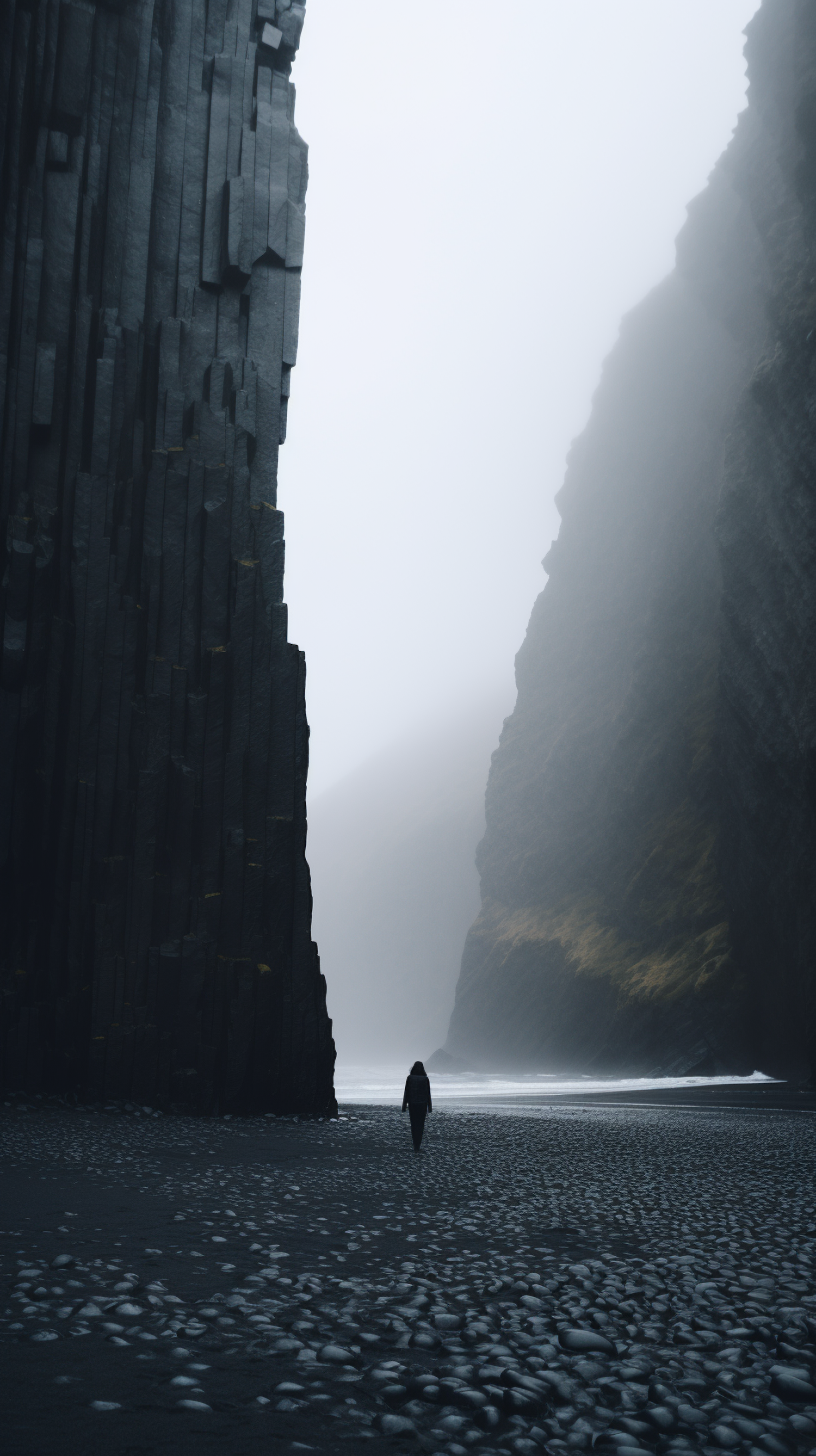 A lone figure walks along a misty beach flanked by towering basalt cliffs, creating a dramatic and moody landscape scene.