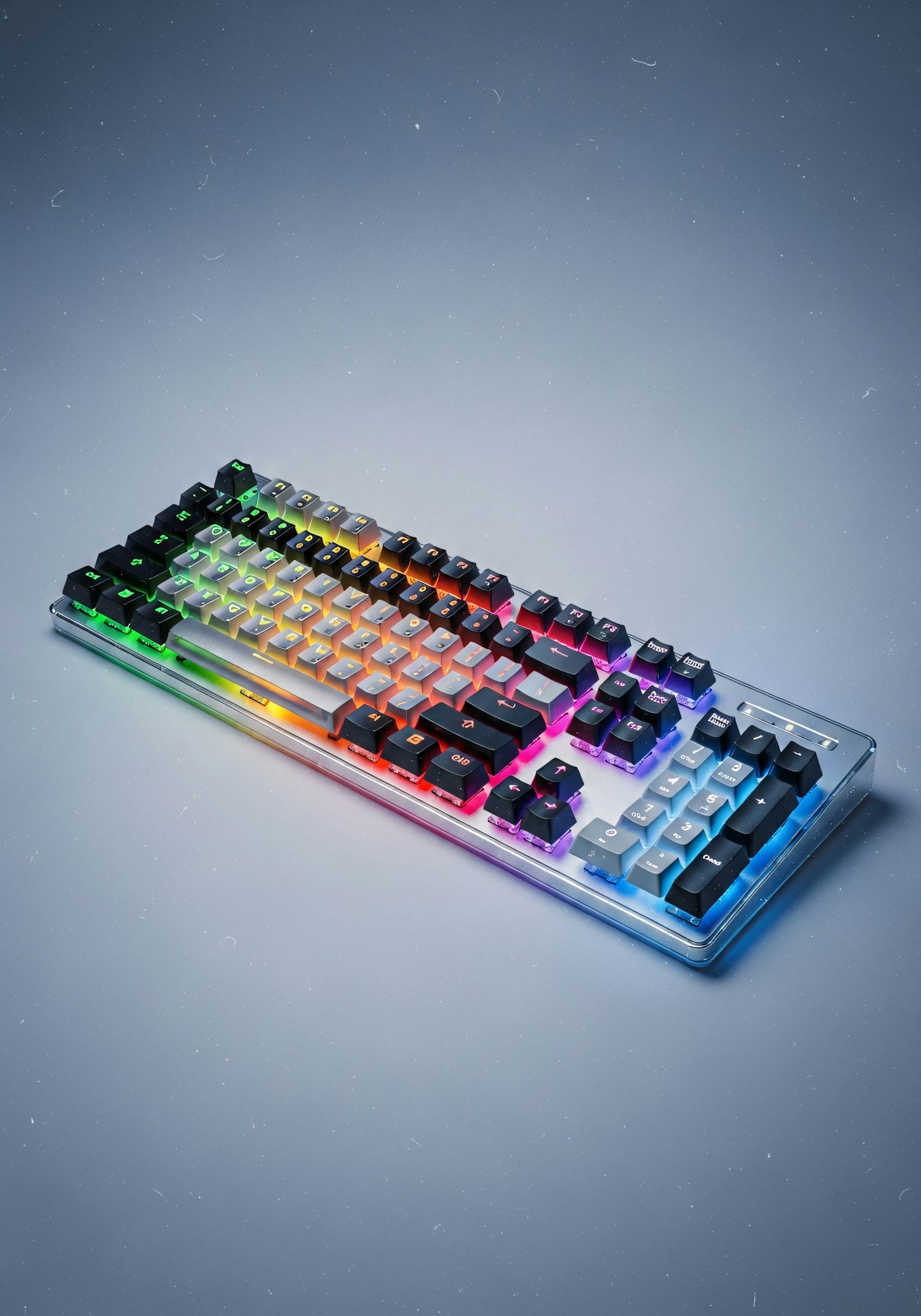 A sleek mechanical keyboard with vibrant RGB lighting and a transparent casing, perfect for gaming or stylish computing setups.