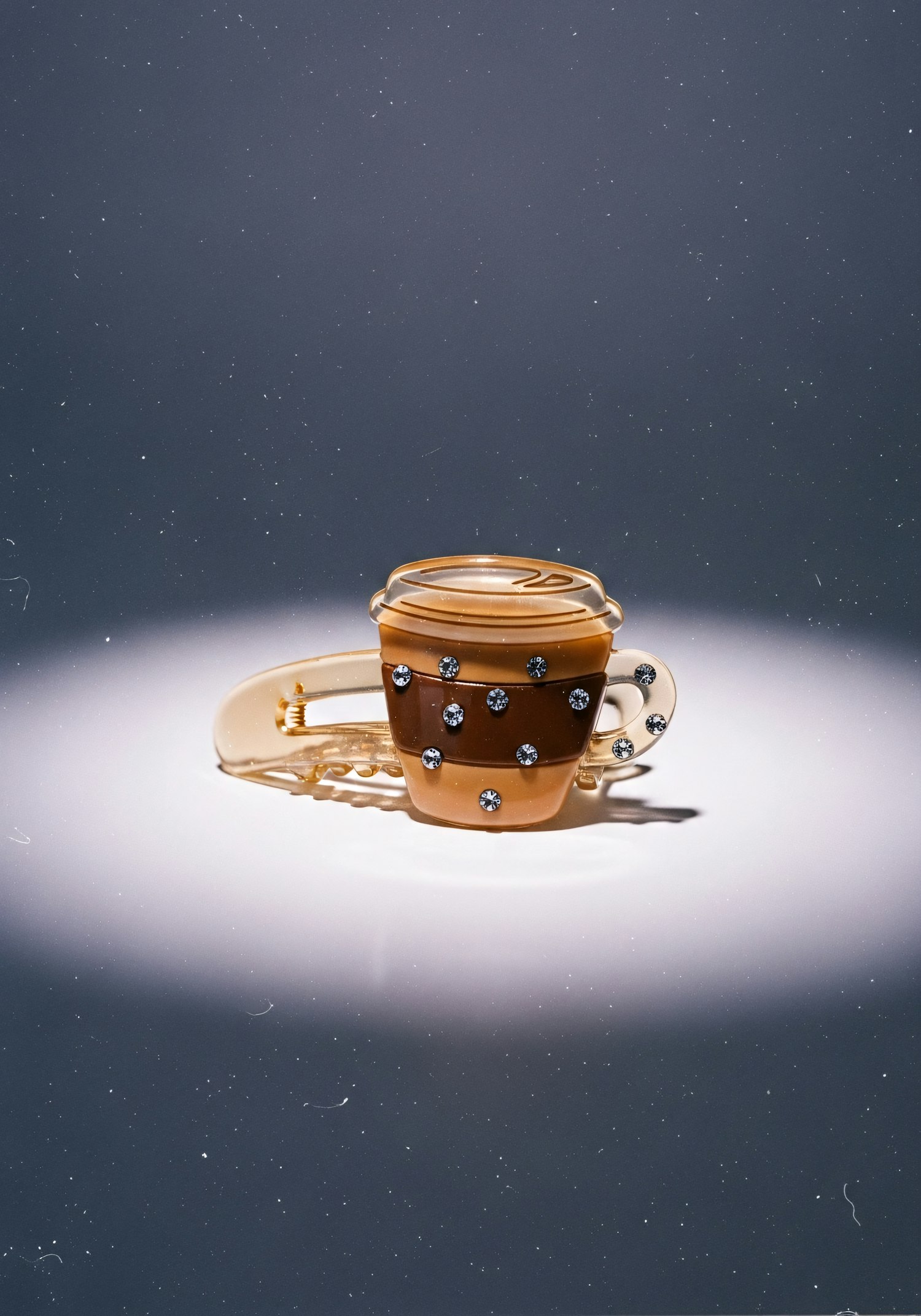 A stylish coffee cup-shaped hair clip with rhinestone accents, set against a dark background with a spotlight effect.